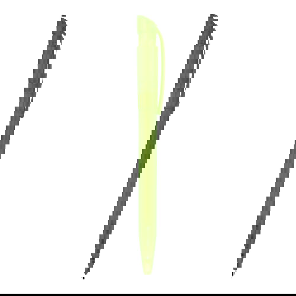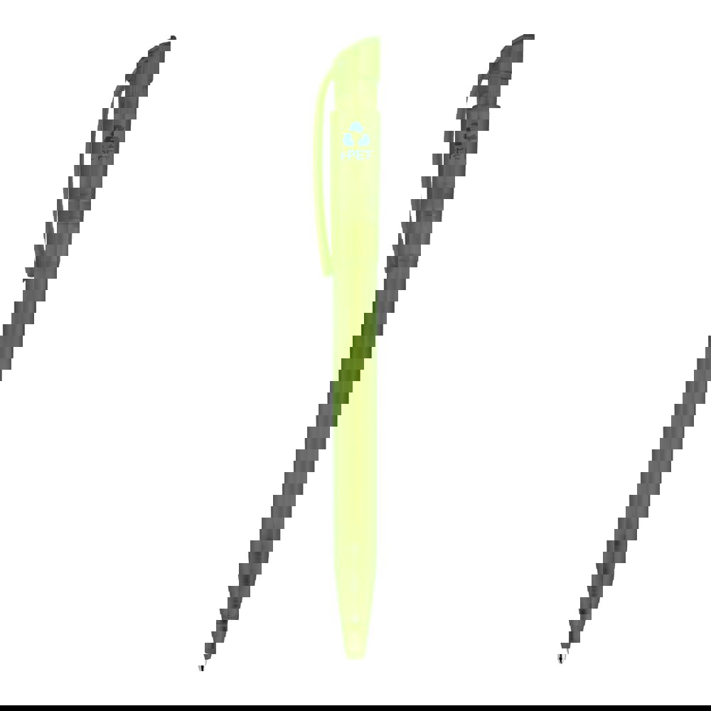 Moderner transparenter Kugelschreiber mit einem gebogenen Clip aus R-PET-Material. R-PET bedeutet recycelten PET-Kunststoff. Mit einer großen Druckfläche ist es ein idealer Werbeartikel. Der Druckkugelschreiber wird mit einer blau schreibenden X20-Refill-Mine geliefert.