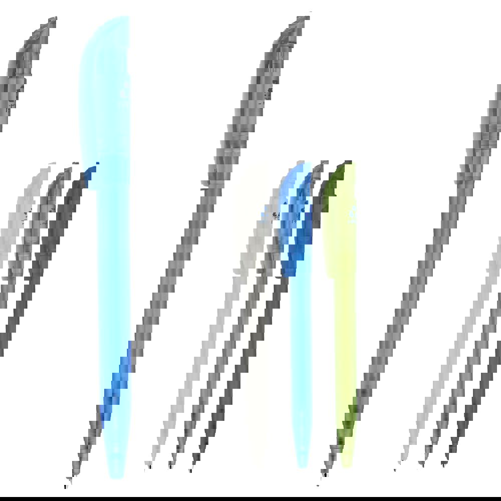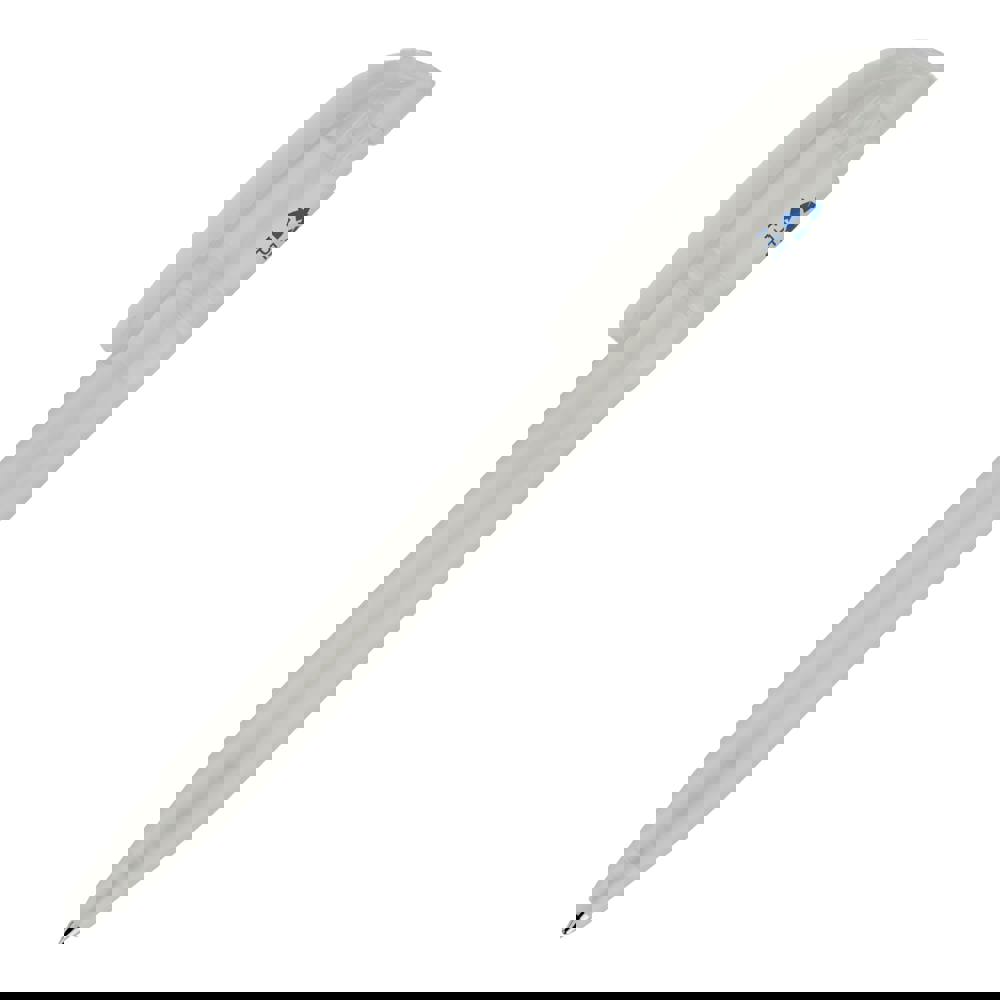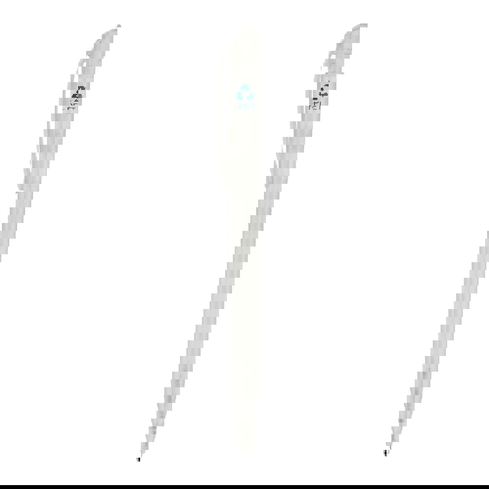 Moderner transparenter Kugelschreiber mit einem gebogenen Clip aus R-PET-Material. R-PET bedeutet recycelten PET-Kunststoff. Mit einer großen Druckfläche ist es ein idealer Werbeartikel. Der Druckkugelschreiber wird mit einer blau schreibenden X20-Refill-Mine geliefert.