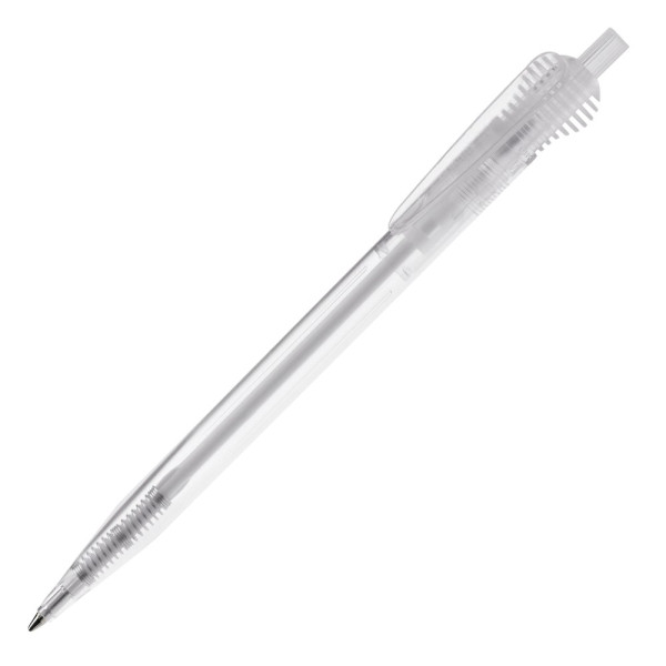 Schlanker Toppoint Kugelschreiber mit rundem Clipteil. Made in Germany. Ausgestattet mit einer X20-Mine, blauschreibend. Schreibleistung 2,5km. Transparent.