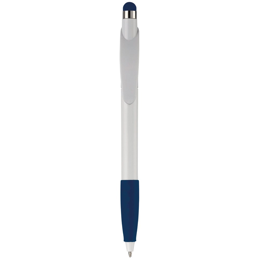 Kunststoffkugelschreiber mit Bogenclip, Gummimanschette und Stylus. Drehmechanik. Toppoint Design. Blauschreibend.