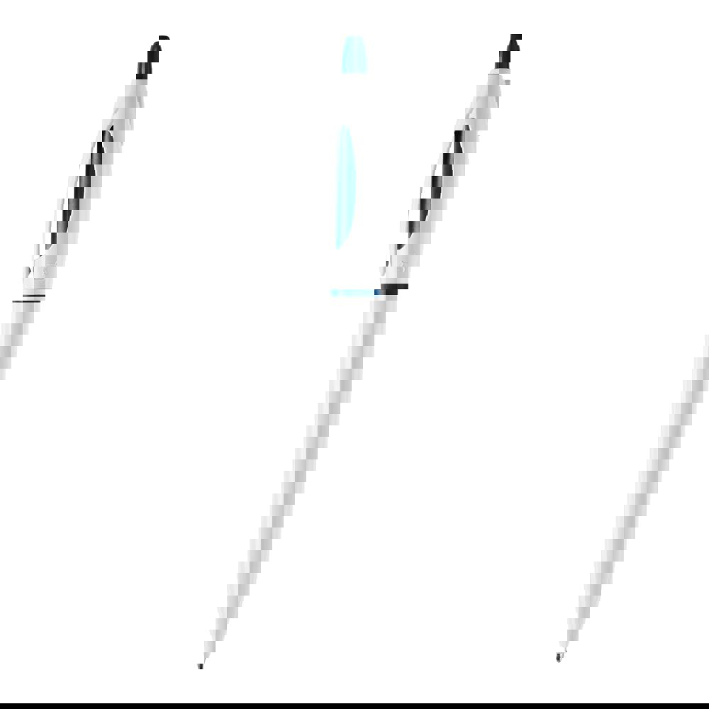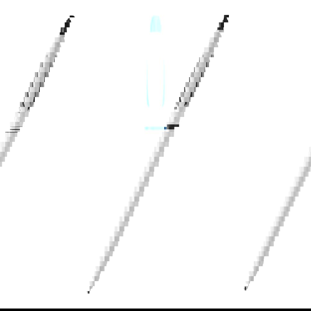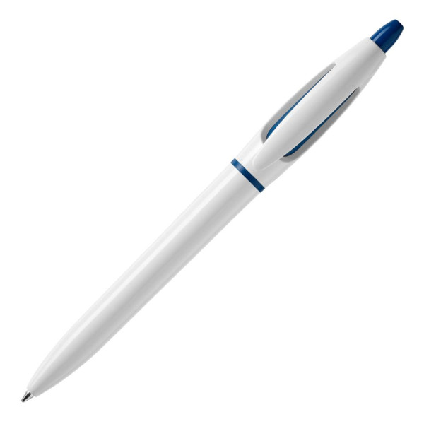 Der Hardcolour Kugelschreiber S! mit weißem Schaft und weißen Clip. Der Drücker und der Ring sind farbig. Ausgestattet mit einer blau schreibenden X20-Refill-Mine. Der Kugelschreiber besteht aus ABS und wird in Europa hergestellt. Ab einer Abnahmemenge von 5.000 Stück sind eigene Farbkombinationen möglich.