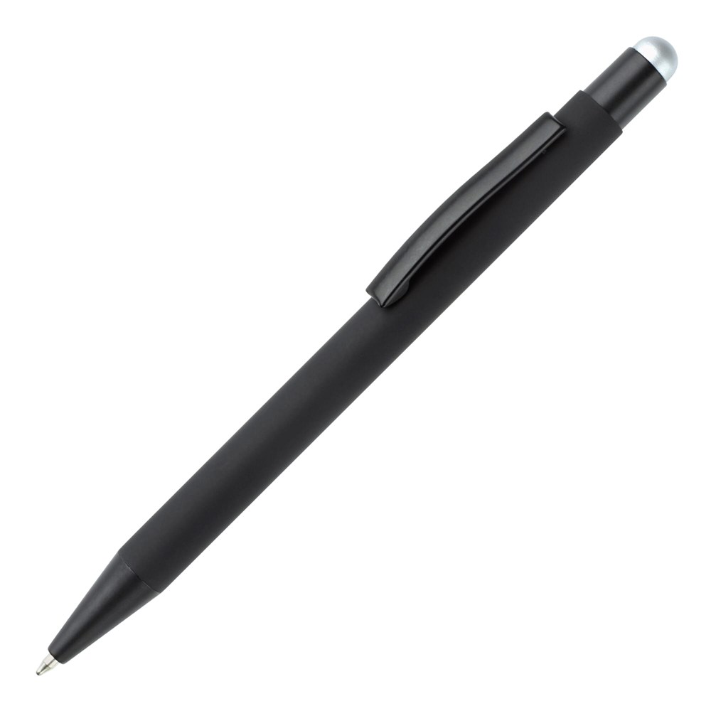 Eleganter Metall Kugelschreiber mit schwarzen Besätzen. Der Kugelschreiber wird gelasert und das Logo erscheint in der Farbe des Stylus Tip. Schriftfarbe: blau.