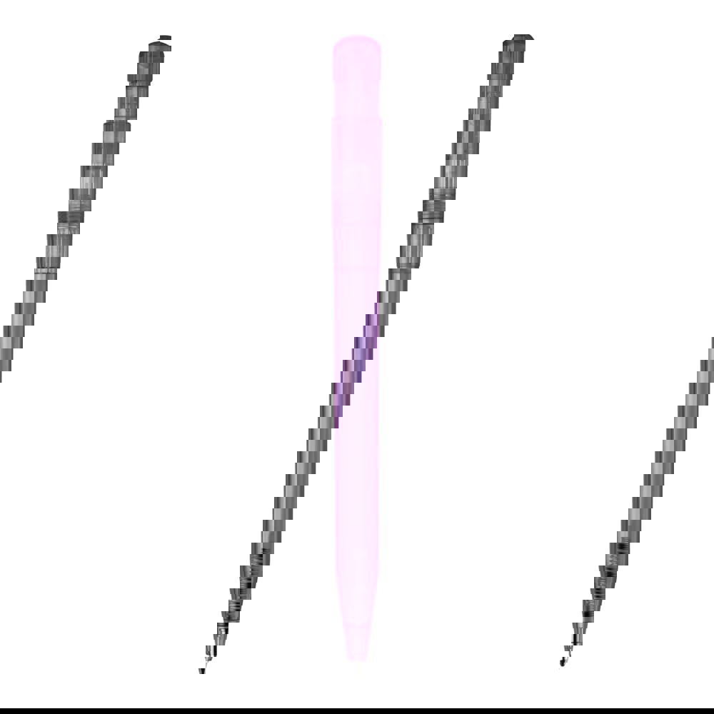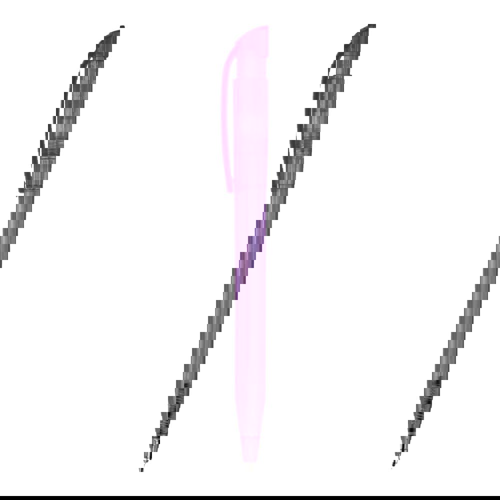 Moderner transparenter Kugelschreiber mit gebogenem Clip. Ein beliebter Werbeartikel wegen seiner großen Druckfläche. Druckkugelschreiber ausgestattet mit einer blau schreibenden X20-Refill-Mine. Druckkugelschreiber aus ABS, hergestellt in Europa. Ab einer Abnahmemenge von 5.000 Stück sind eigene Farbkombinationen möglich.