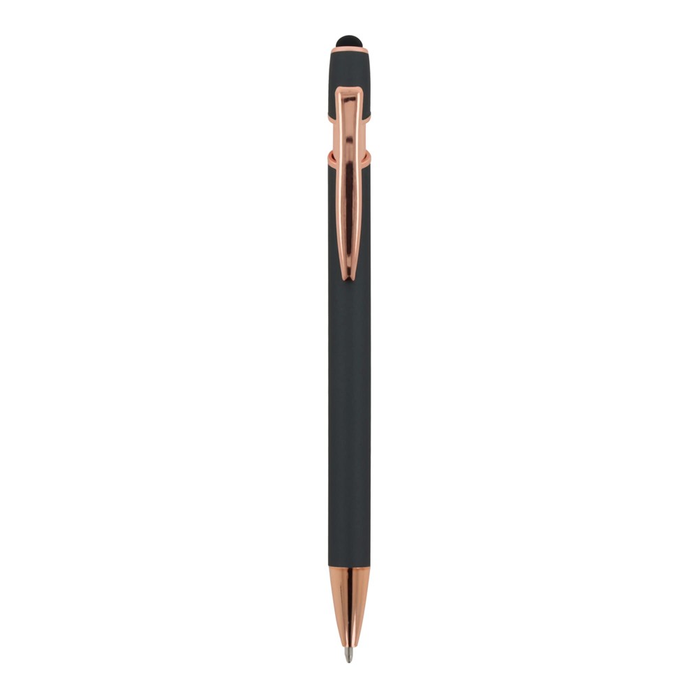 Kugelschreiber aus roségoldenem Aluminium mit eleganter Soft-Touch-Oberfläche und Stylus. Mit massivem Metallclip. Schreibfarbe: blau.