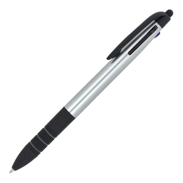 3-farbiger Metallic-Kugelschreiber mit Stylus und weichem Ergogriff. Die Schreibfarben sind Schwarz, Blau und Rot.