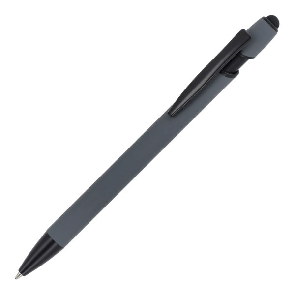 Kugelschreiber Paris aus recyceltem Aluminium mit Softtouch-Oberfläche. Der Kugelschreiber verfügt über eine Stylus-Funktion und schwarze Akzente. Mit blauer Schreibmine.