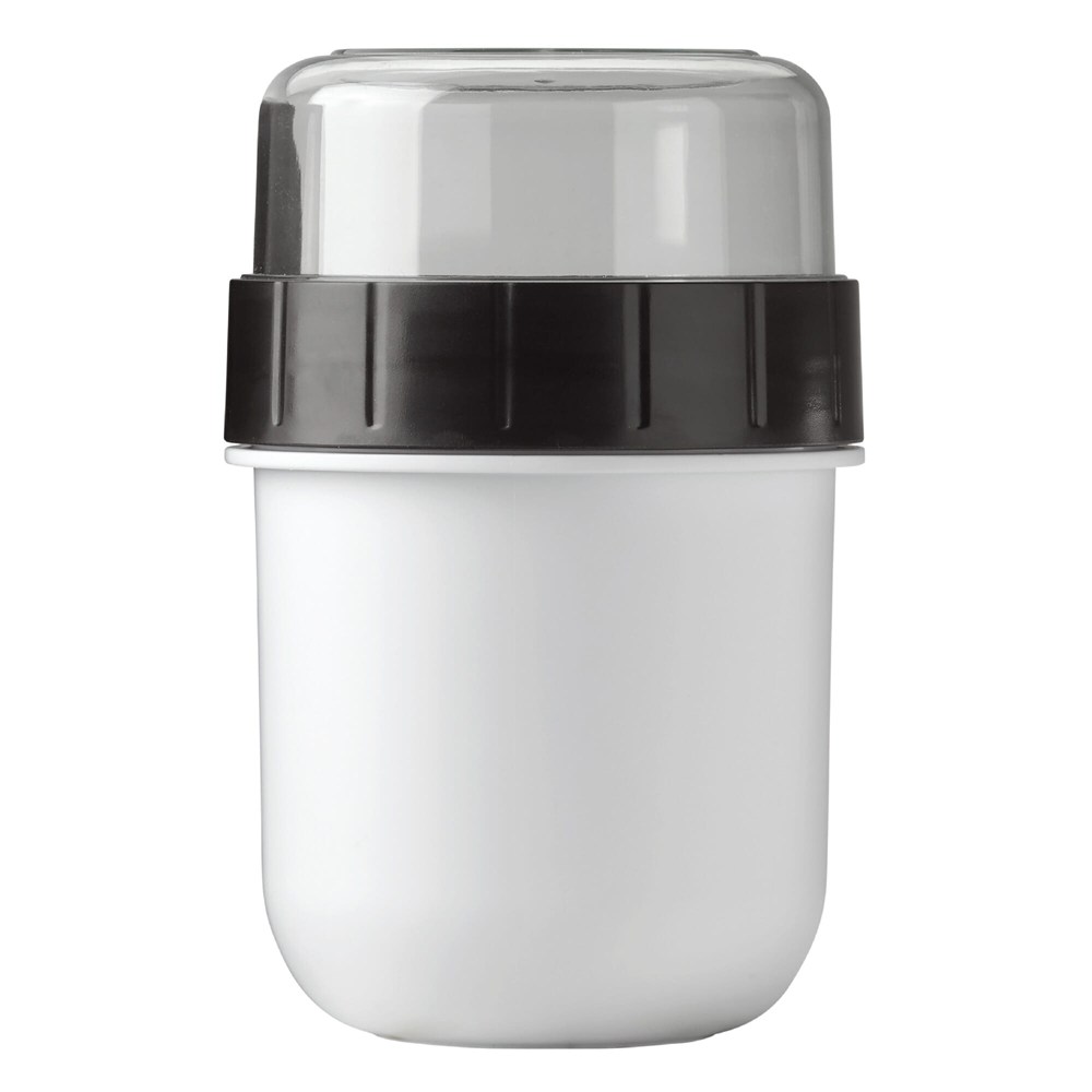 Idealer Becher mit zwei Fächern. Der große Trinkbecher, den Sie mit Joghurt oder Suppe füllen können und das kleine Fach oben können Sie mit Müsli, Obst oder Croutons füllen. So bleibt alles frisch und knusprig.