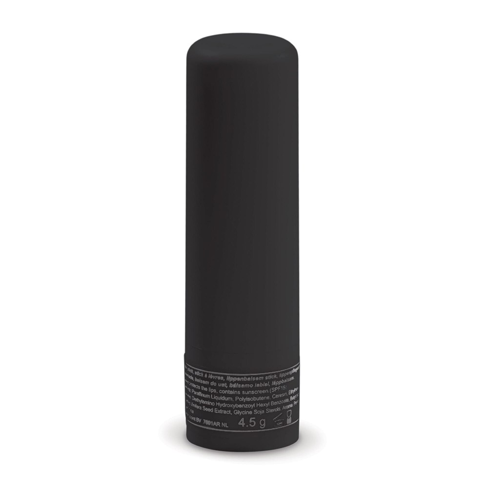 Lippenbalsam (SPF15) in einem runden Gehäuse. An der Unterseite des Stifts ist ein Drehmechanismus zum herausdrehen des Pflegestifts. Lieferbar in transparenten Farben oder einfarbig in schwarz oder weiß.