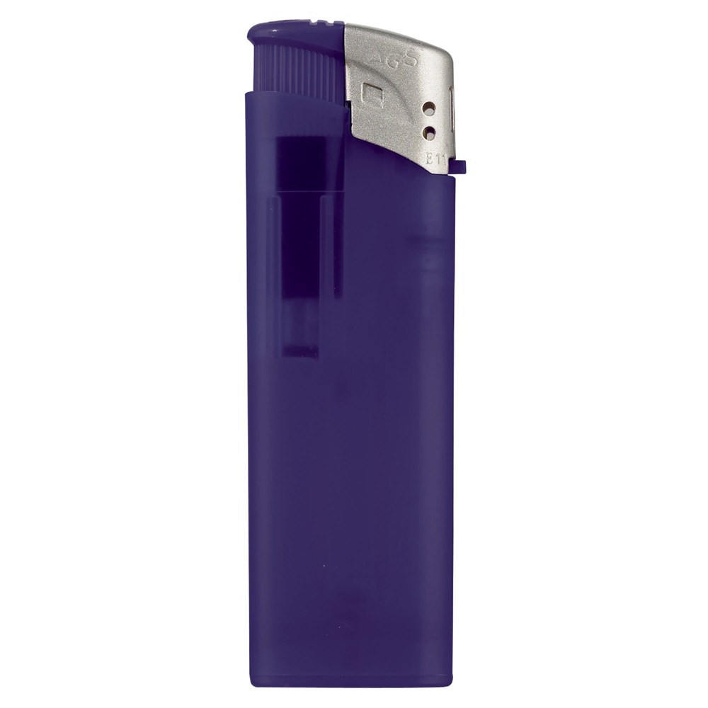 Elektronisches, nachfüllbares Feuerzeug in gefrosteten Farben mit matt silberner Kappe. Mit Kindersicherung.