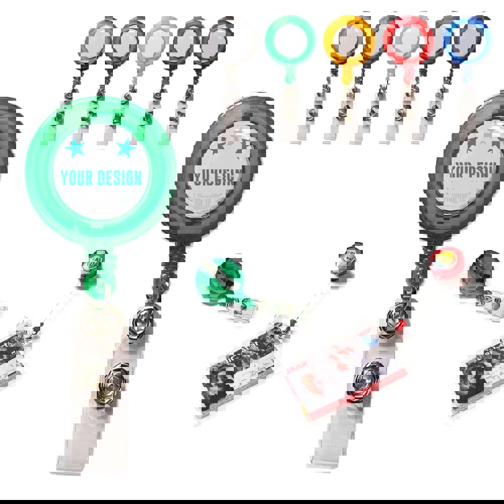 Transparenter Namensschildhalter mit Ausziehband: 50cm und Clip auf der Rückseite. Werbeanbringung mittels Doming.