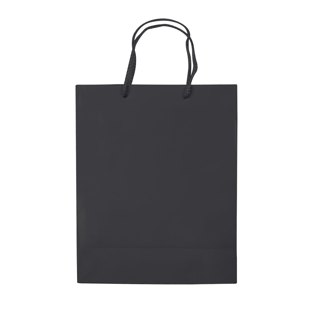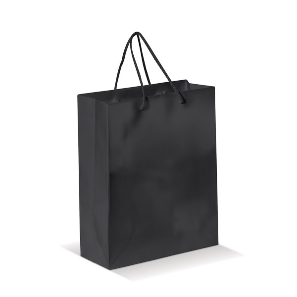 Mittelgroße Papiertüte mit Seilgriffen. Erhältlich in mehreren Farben mit Riemen in Schwarz oder Weiß. Große Druckfläche auf beiden Seiten. Starke Tasche. Glänzende Laminierung.