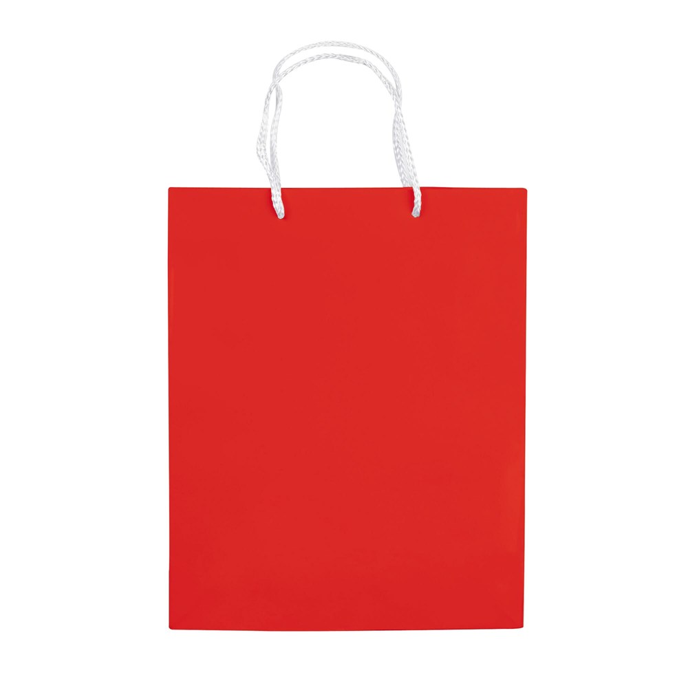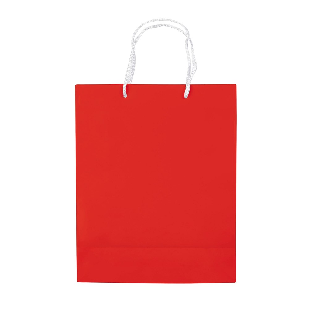 Mittelgroße Papiertüte mit Seilgriffen. Erhältlich in mehreren Farben mit Riemen in Schwarz oder Weiß. Große Druckfläche auf beiden Seiten. Starke Tasche. Glänzende Laminierung.