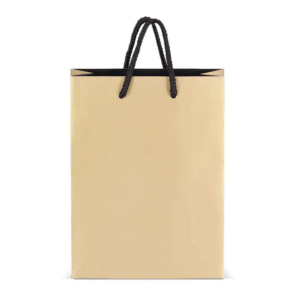 Elegante Geschenktasche aus Papier mit 5 mm dicken Kordeln aus recyceltem Polyester. Sie ist für ein Gewicht von bis zu 3 kg ausgelegt und hat ein luxuriöses Aussehen mit schwarzen Griffen und einer schwarzen Innenseite. Perfekt zum Überreichen von Geschenken.