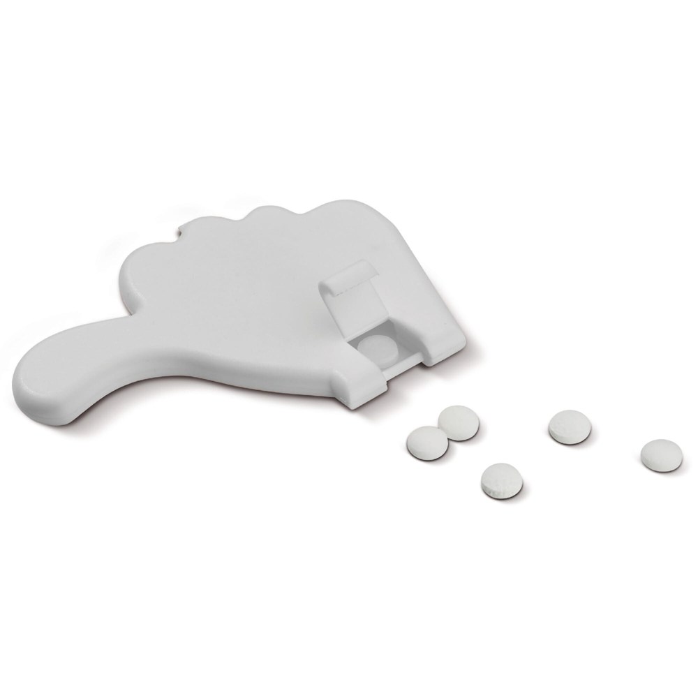 Pfefferminzdose in Daumenform, die Öffnung befindet sich am Handgelenk. Ca. 5g zuckerfreies Pfefferminz. Die Oberfläche ist für einen vollfarbigen Digitaldruck geeignet. Daumen hoch!