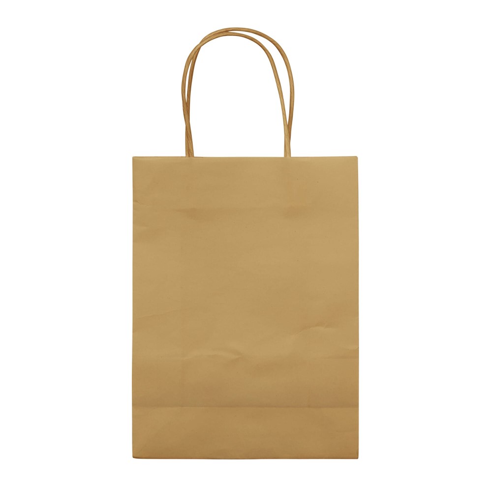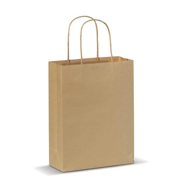 Kleinformatige, matte Papiertragetasche mit Griffen, die aus gedrehtem Papier gefertigt sind. Die Tasche hat einen ökologischen Look. Geeignet als Geschenktasche oder als Tasche für Mitbringsel. FSC-zertifiziert.