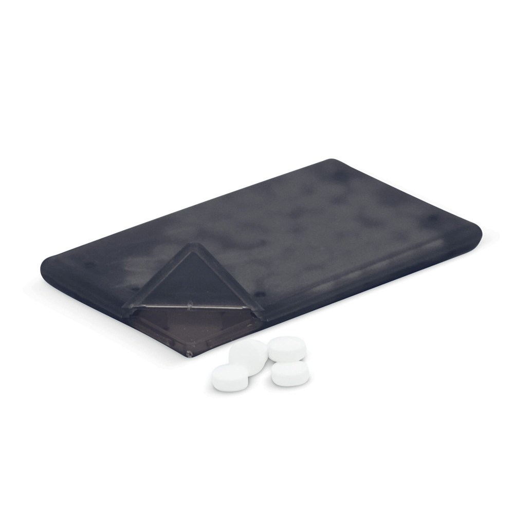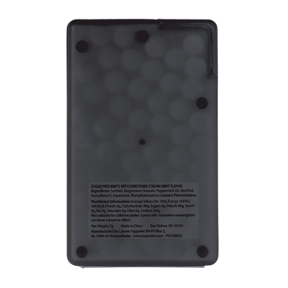 Rechteckiger Pfefferminzspender mit ca. 7g zuckerfreien Pfefferminz. mehr