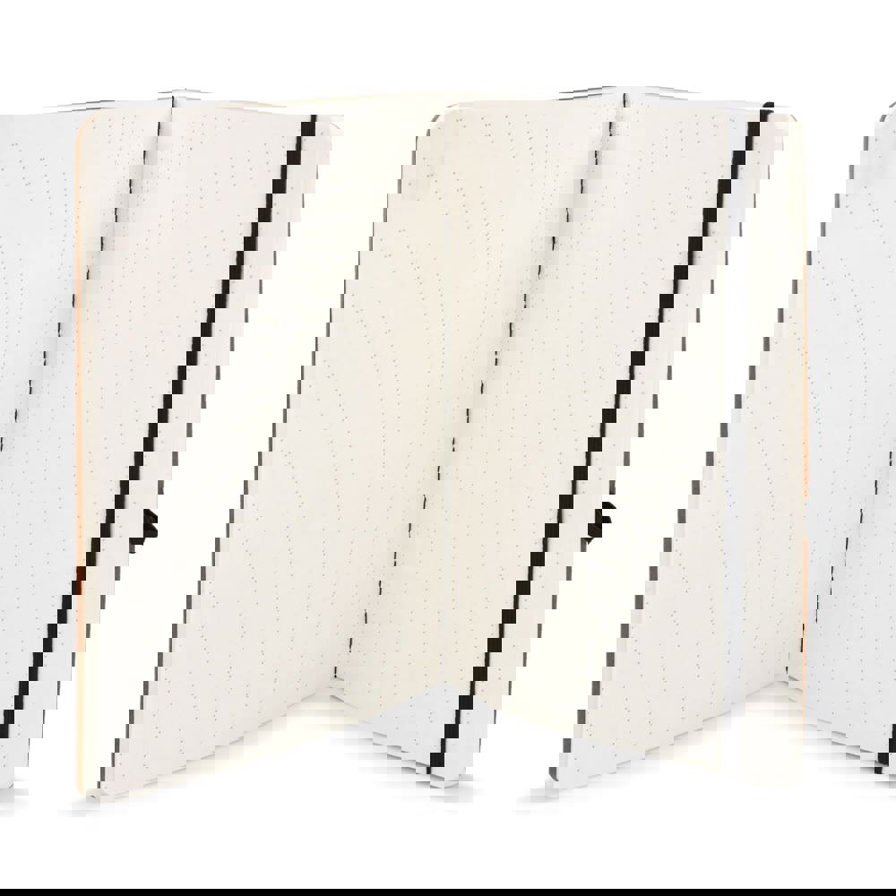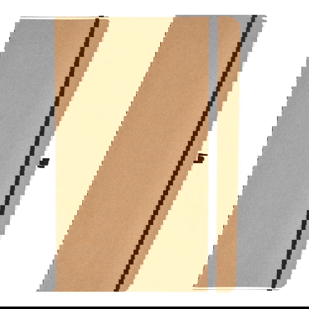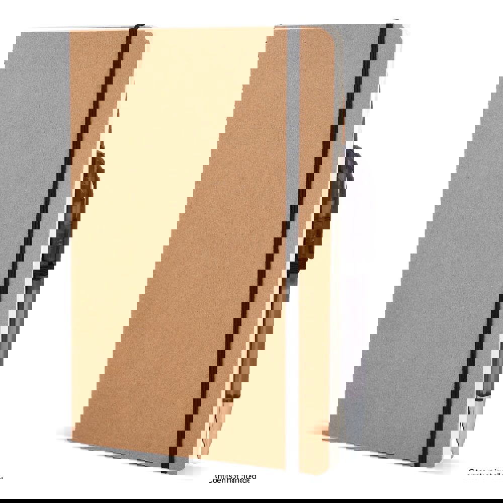 A5-Notizbuch mit weichem Kraftpapiereinband, abgerundeten Ecken, farbigem Gummiverschluss und Stiftschlaufe. Es hat 60 linierte cremefarbene Blätter aus FSC-zertifiziertem Papier. Eine praktische und natürlich wirkende Option für tägliche Notizen.