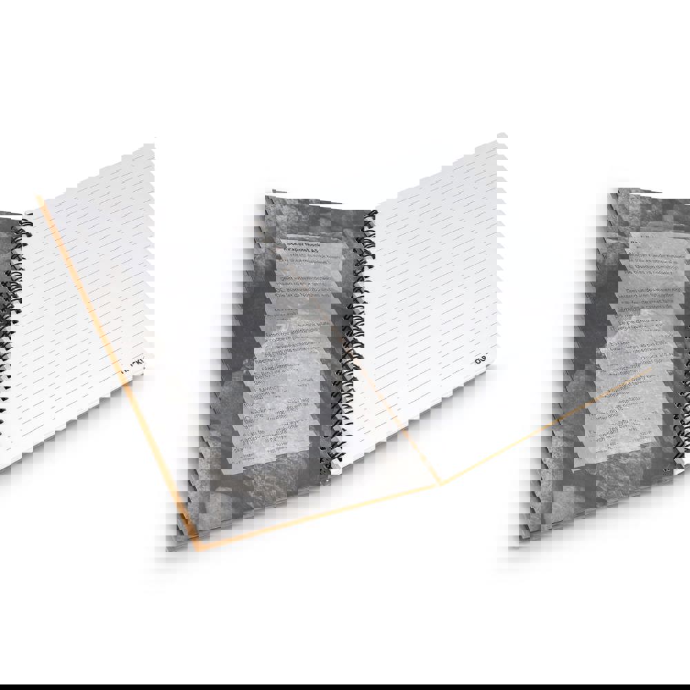 Die Blätter dieses Notizbuches sind aus Steinen gefertigt. Das Resultat ist ein stabiles, glattes Blatt Papier mit einer angenehmen kühlen Haptik. Die Blätter sind an der Seite perforiert, so dass sie leicht aus dem Notebook entnommen werden können.