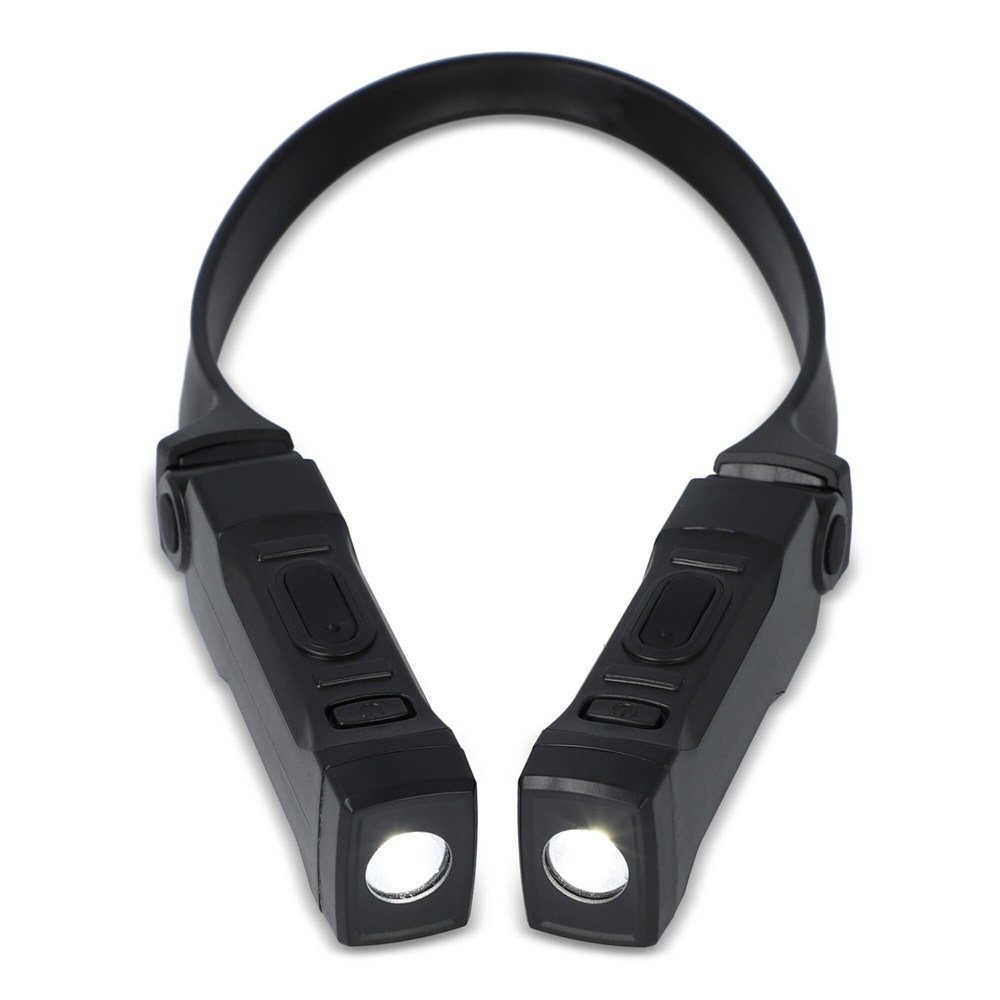 Wiederaufladbare, freihändige Nackentaschenlampe mit zwei SMD-Lichtern und 80 Lumen. Verfügt über drei Modi: 100 %, 50 % und aus. Leicht und praktisch für freihändige Beleuchtung.