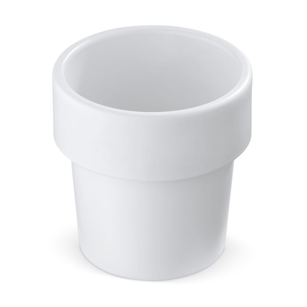 Ein Topf mit Kirschtomatensamen in verschiedenen bunten Farben. Wenn die Pflanze groß genug ist, um sie in den Garten zu bringen, kann der Topf gereinigt werden und ist als Kaffeebecher wiederverwendbar. Der Rand ist doppelwandig, damit man sich beim Trinken nicht die Hand verbrennt.