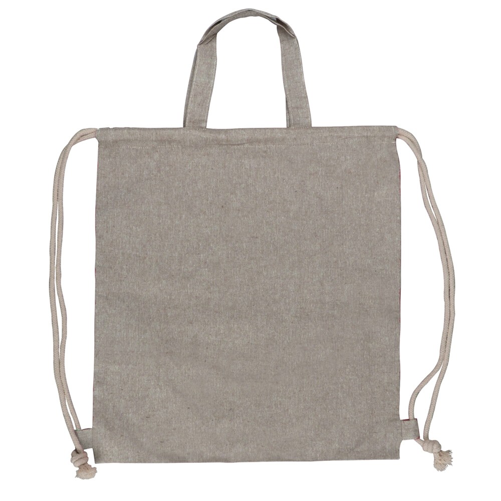 Praktischer Kordelzugbeutel mit Tragegriffen aus recycelter Baumwolle. Die recycelte Baumwolle, die von unterschiedlicher Herkunft ist, verleiht dem Stoff eine einzigartige Optik und Haptik. Die unvermeidlichen Farbabweichungen sind ein Zeichen für den Recycling-Charakter dieser Tasche.