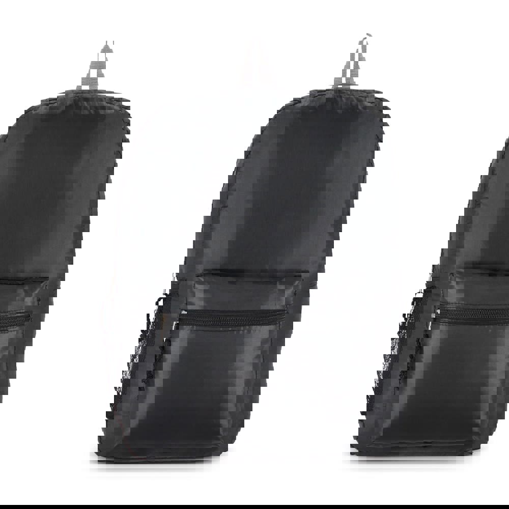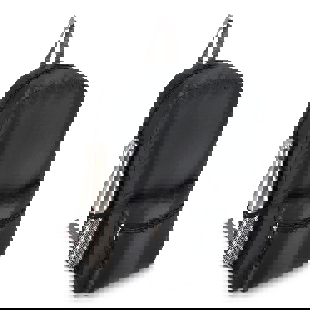 Leichter Rucksack aus recyceltem 190T-PET. Mit Reißverschlusstasche vorne, verstellbaren Schultergurten und einer seitlichen Netztasche für eine Flasche, einen Regenschirm oder andere wichtige Utensilien. Lässt sich klein zusammenfalten – ideal für Tagesausflüge auf Reisen.