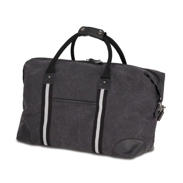 Elegante Weekender-Tasche aus recyceltem Baumwoll-Canvas. Mit 100% recyceltem, reflektierendem Gurtband, luxuriösen Reißverschlüssen und Griffen sowie einem Futter aus 100% recyceltem Polyester. Mit verstellbarem, abnehmbarem Schultergurt, 1 Fronttasche und 2 Innentaschen, eine davon mit Reißverschluss.