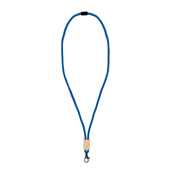 Kordel-Lanyard aus R-PET Paracord mit Kunststoff-Sicherheitsverbindung und schwarzem Karabiner und Panikverschluss. Das Schlüsselband ist mit einem Bambusschieber verstellbar, der viel Platz für das Branding bietet.
