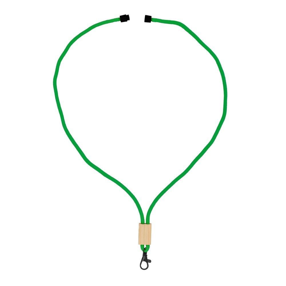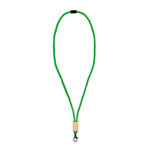 Kordel-Lanyard aus R-PET Paracord mit Kunststoff-Sicherheitsverbindung und schwarzem Karabiner und Panikverschluss. Das Schlüsselband ist mit einem Bambusschieber verstellbar, der viel Platz für das Branding bietet.