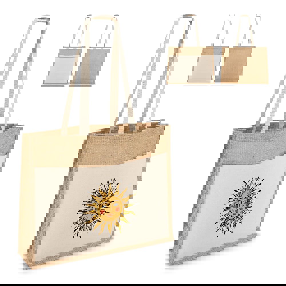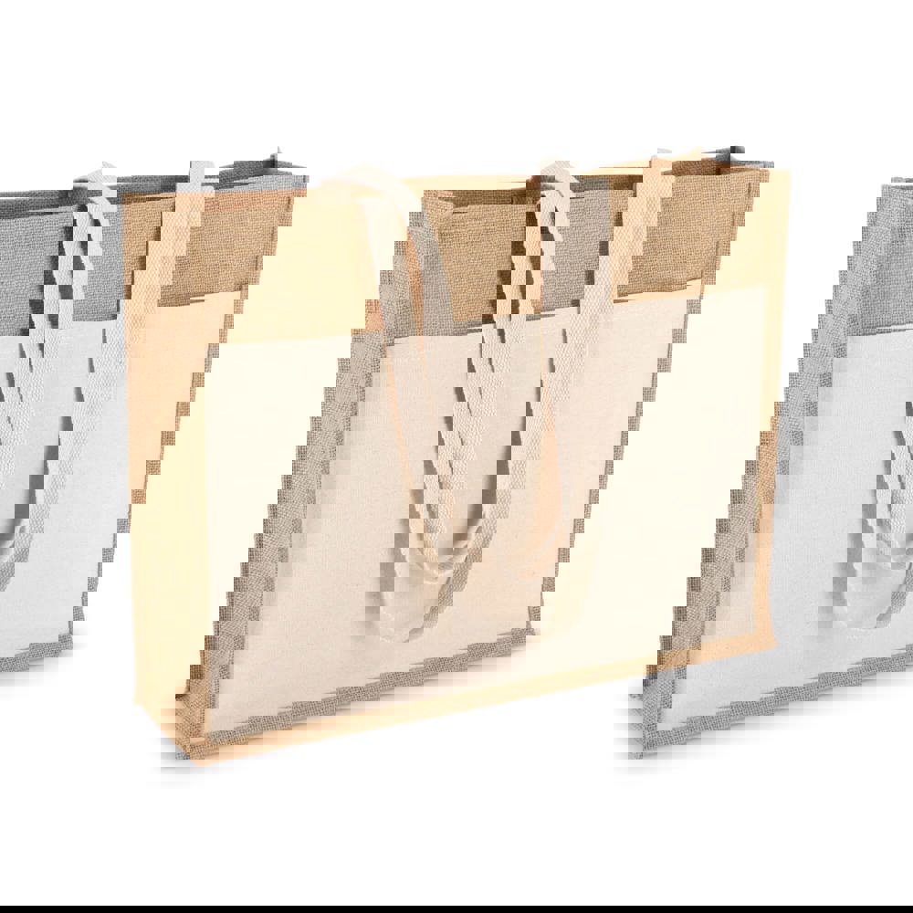 Robuster Jutebeutel mit einer Vordertasche aus Baumwolle und passenden Baumwollgriffen. Hergestellt aus 320 g/m² Material, das für den täglichen Gebrauch geeignet ist. Oeko-Tex® zertifiziert für geprüfte, sichere Textilien. Ideal zum Einkaufen oder für einen Tag am Strand.
