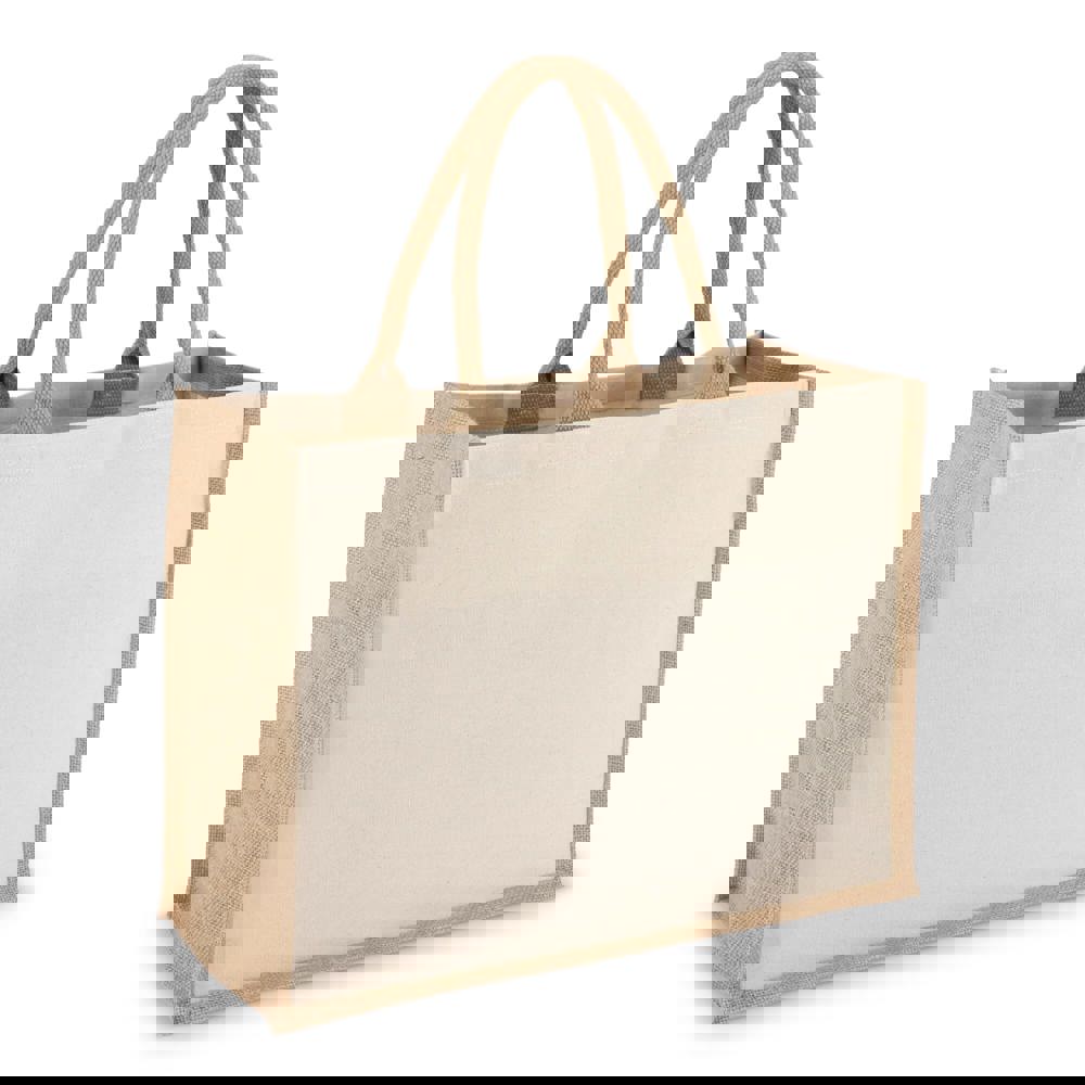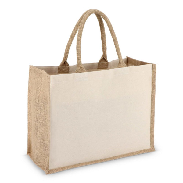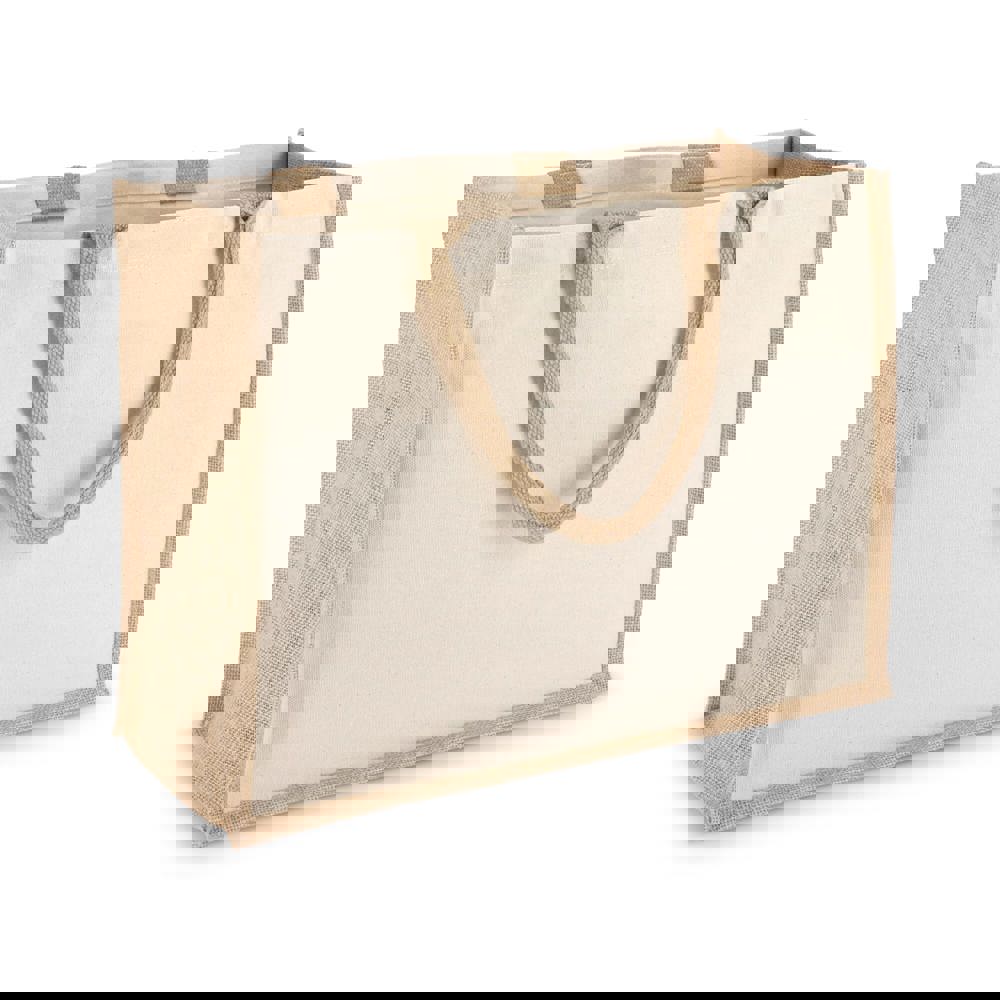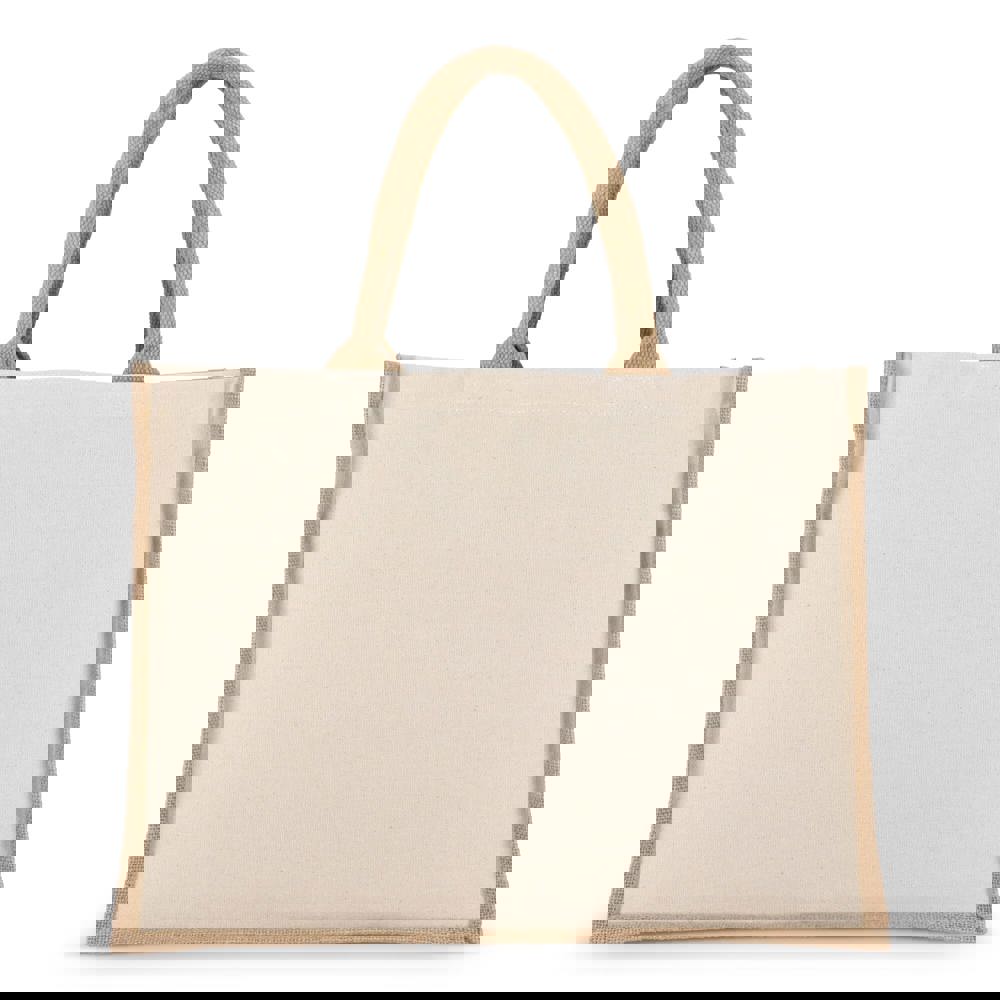 Tasche mit Vorder- und Rückseite aus natürlichem Baumwoll-Canvas, kombiniert mit Seiten und Boden aus Jute - alles 320 g/m². Ausgestattet mit farblich abgestimmten Baumwollgriffen für ein einheitliches, natürliches Aussehen. Oeko-Tex®-zertifiziert. Ideal für den Einzelhandel, Veranstaltungen oder den täglichen Gebrauch.