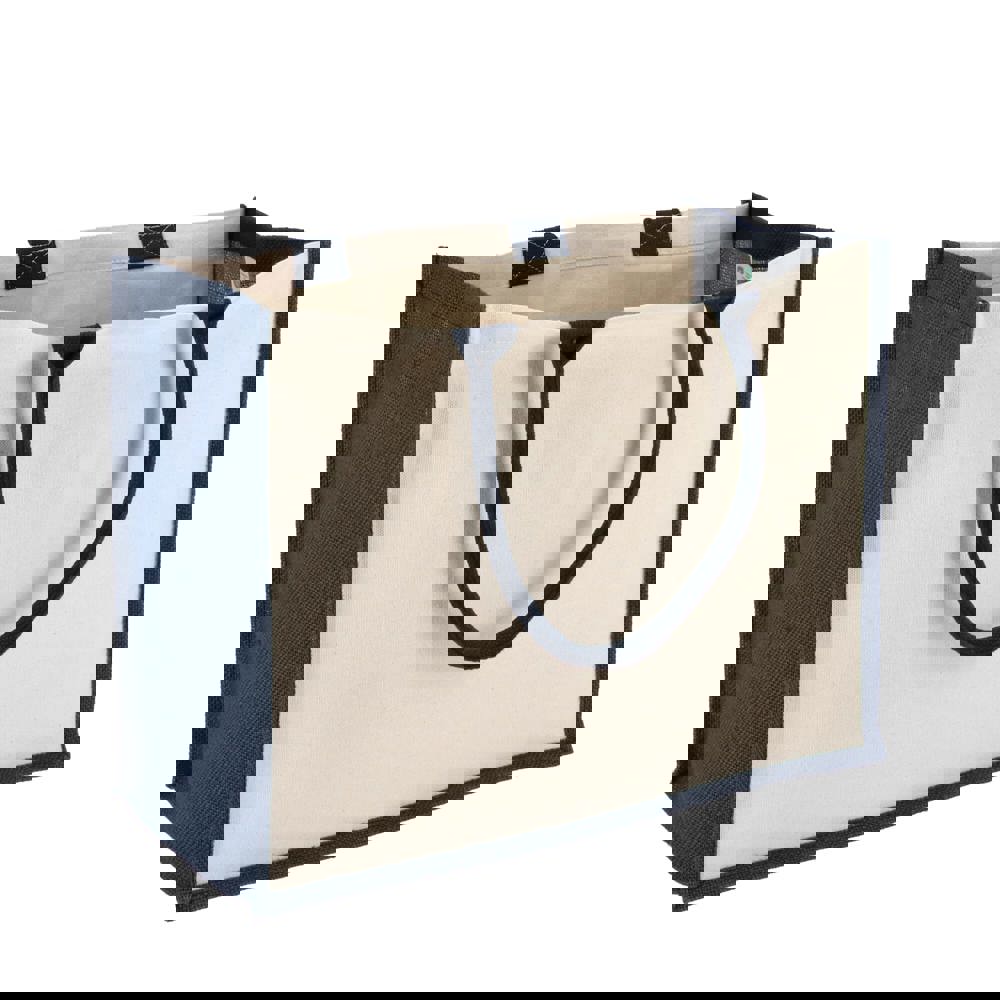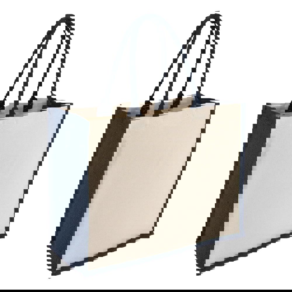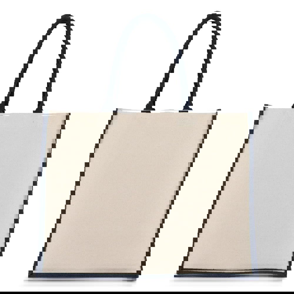 Elegante Tasche mit Vorder- und Rückwand aus Baumwoll-Canvas und Seiten und Boden aus Jute - alles 320 g/m². Die Baumwollgriffe und Seitenwände in Akzentfarben sorgen für zusätzlichen optischen Reiz. Oeko-Tex®-zertifiziert. Ideal für den Einzelhandel, Veranstaltungen oder den täglichen Gebrauch.