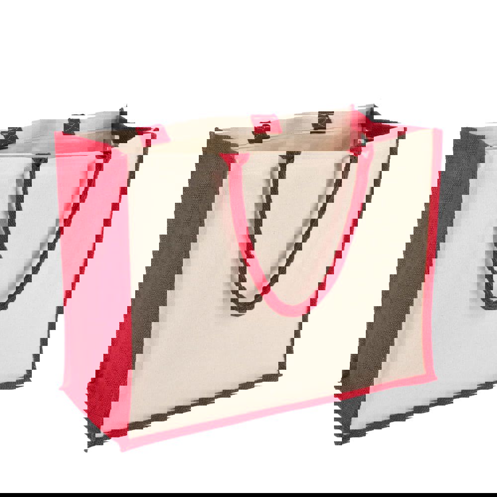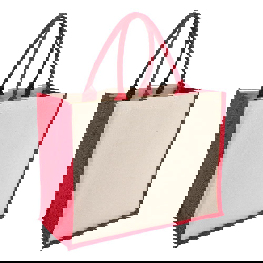 Elegante Tasche mit Vorder- und Rückwand aus Baumwoll-Canvas und Seiten und Boden aus Jute - alles 320 g/m². Die Baumwollgriffe und Seitenwände in Akzentfarben sorgen für zusätzlichen optischen Reiz. Oeko-Tex®-zertifiziert. Ideal für den Einzelhandel, Veranstaltungen oder den täglichen Gebrauch.