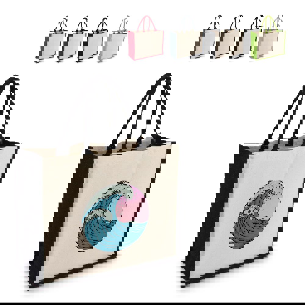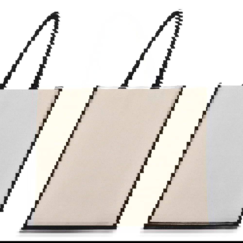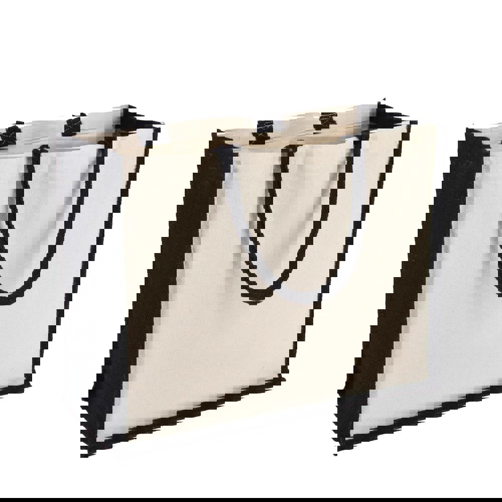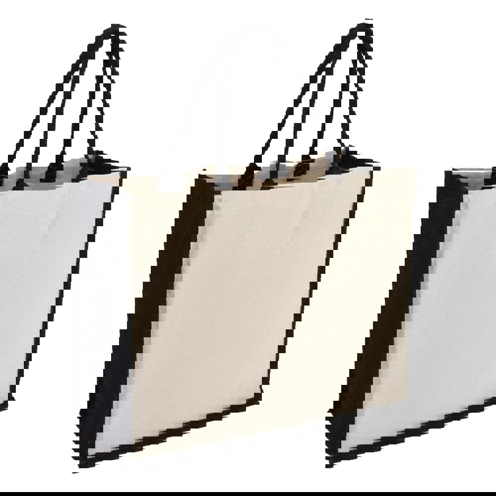 Elegante Tasche mit Vorder- und Rückwand aus Baumwoll-Canvas und Seiten und Boden aus Jute - alles 320 g/m². Die Baumwollgriffe und Seitenwände in Akzentfarben sorgen für zusätzlichen optischen Reiz. Oeko-Tex®-zertifiziert. Ideal für den Einzelhandel, Veranstaltungen oder den täglichen Gebrauch.