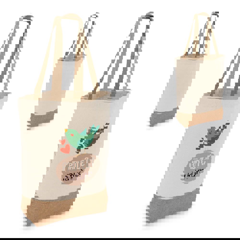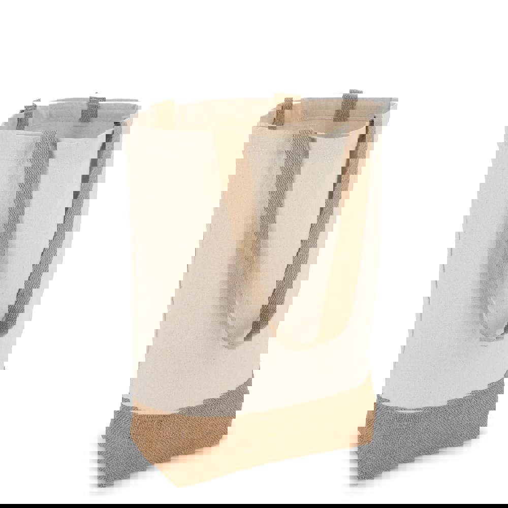 Strapazierfähige Tasche mit Vorder- und Rückwand aus Baumwoll-Canvas und Bodenfalte aus Jute - alles 320 g/m². Oeko-Tex® zertifiziert für sichere, geprüfte Materialien. Eine praktische und stilvolle Option für den Einzelhandel, Veranstaltungen oder den täglichen Gebrauch.