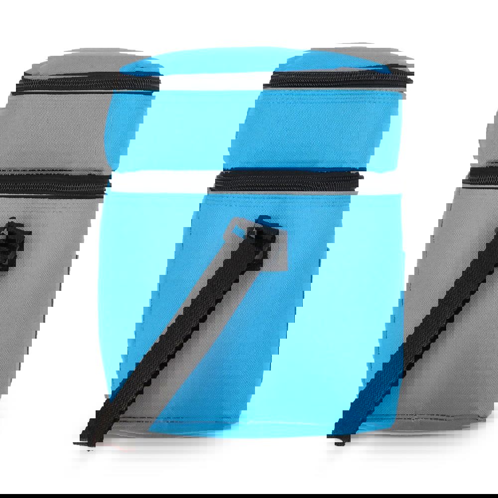 12-Liter-Kühltasche aus haltbarem, recyceltem PET 600D. Mit zwei Fächern für die Organisation von Lebensmitteln. Mit Alufolienfutter und einer Vordertasche. Praktisch und geräumig.