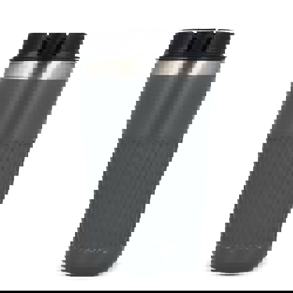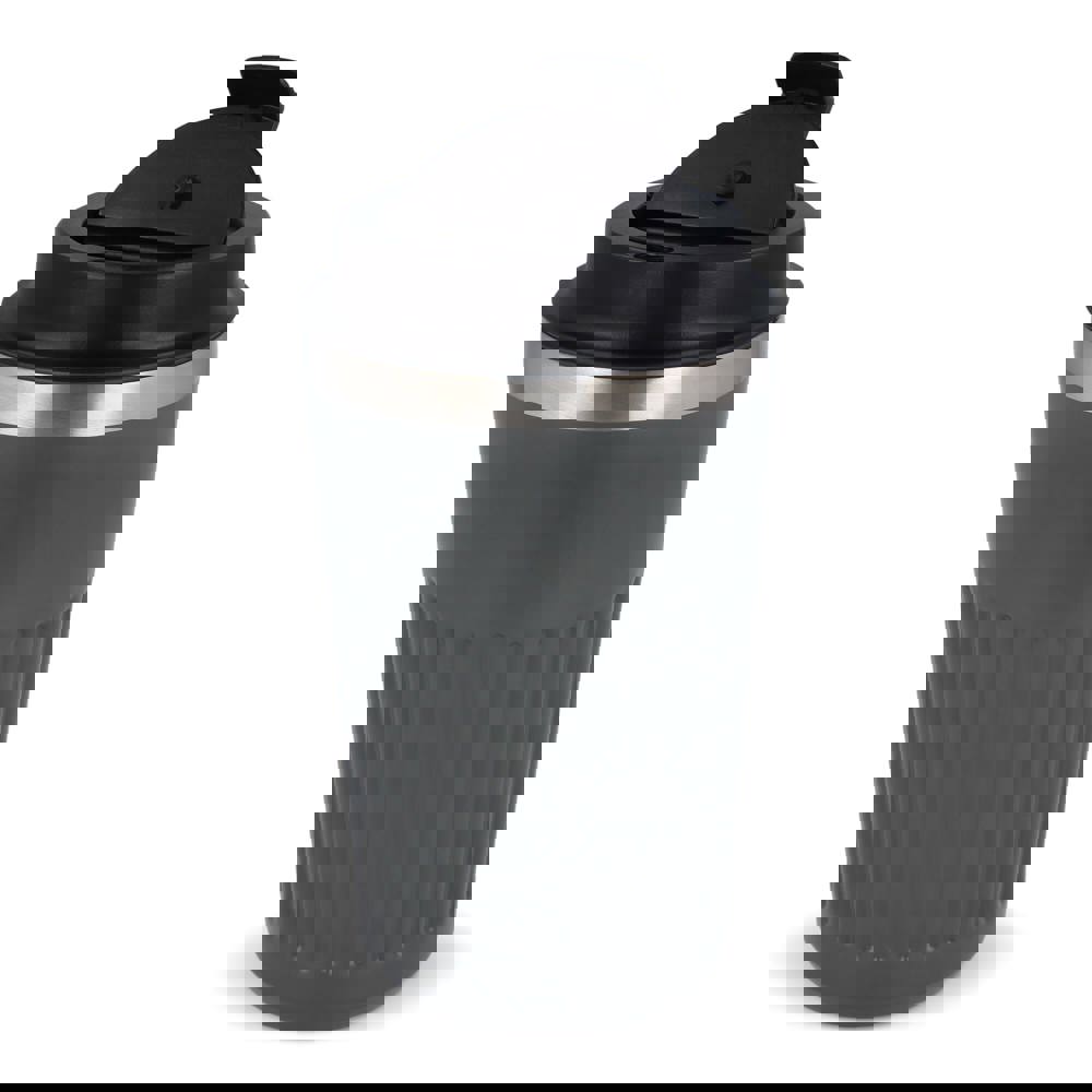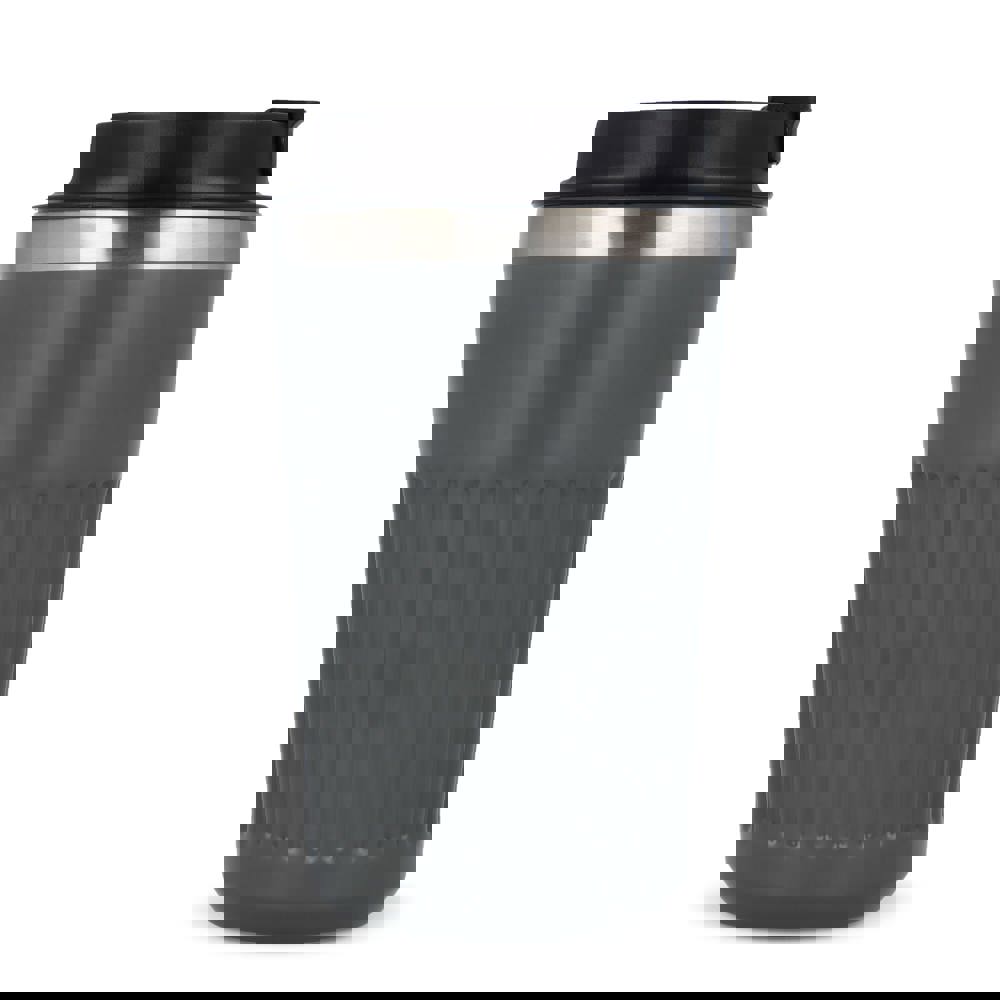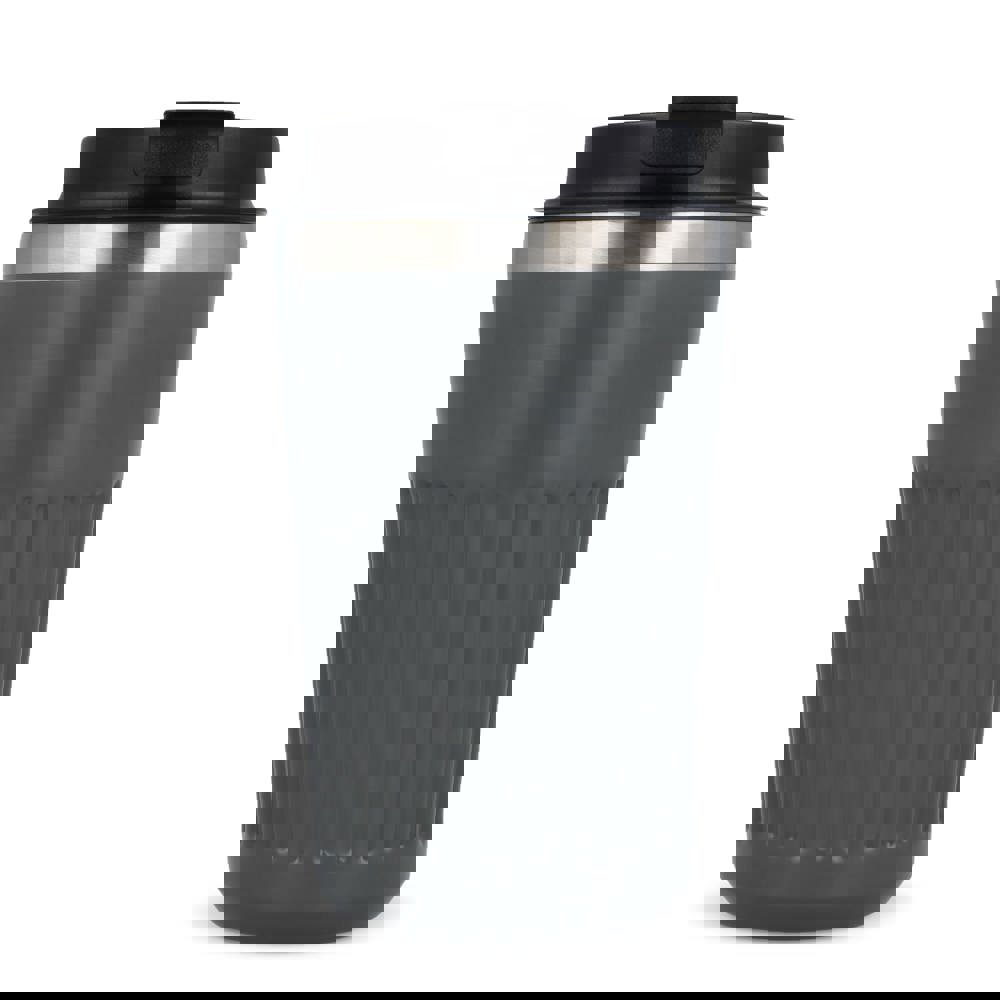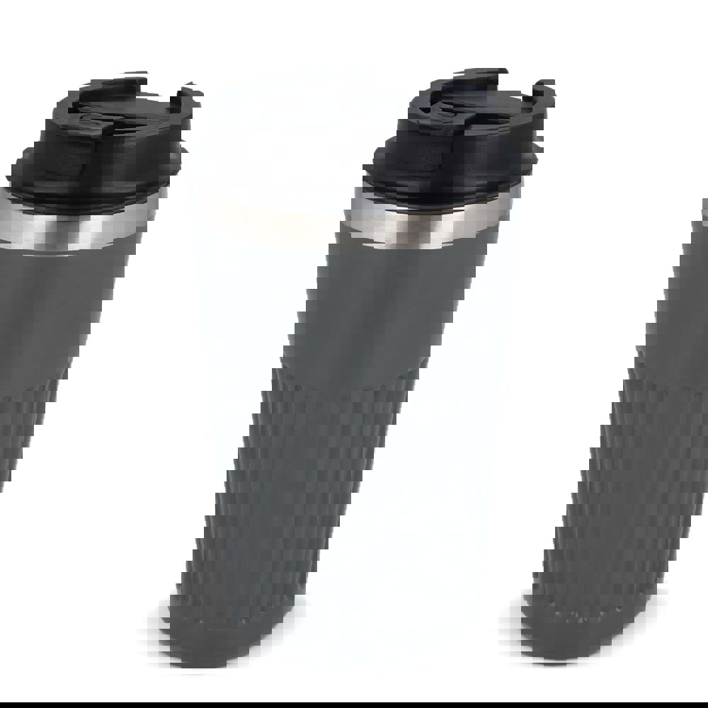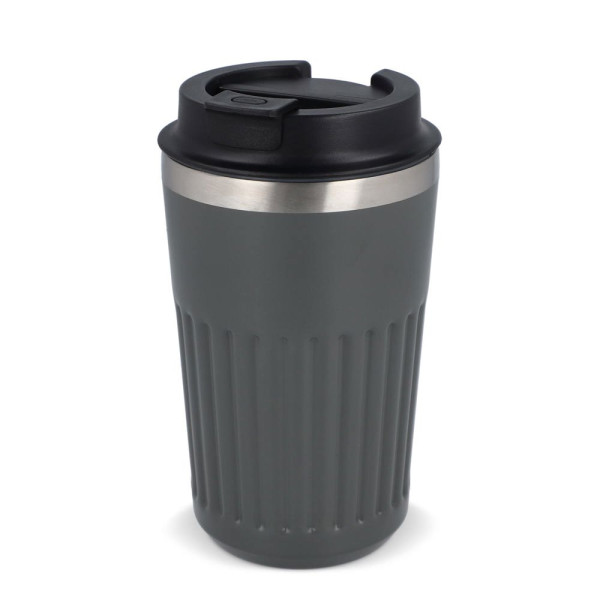 Recycelter Edelstahl-Thermobecher für Kaffee zum Mitnehmen, 400 ml, mit auslaufsicherem Deckel. Der Becher hat ein modernes Streifenmuster, in einer Geschenkbox verpackt.