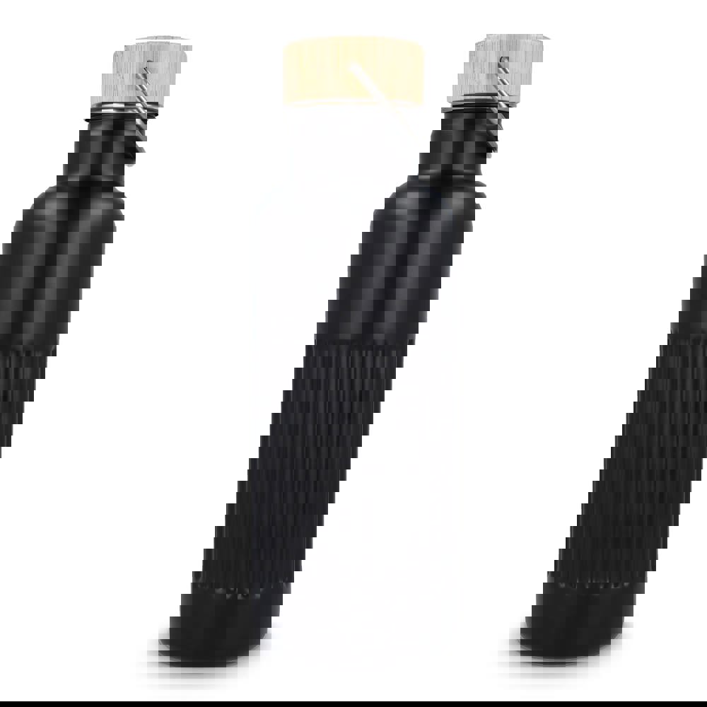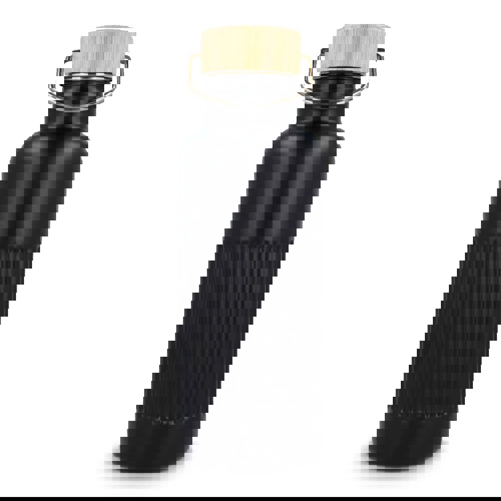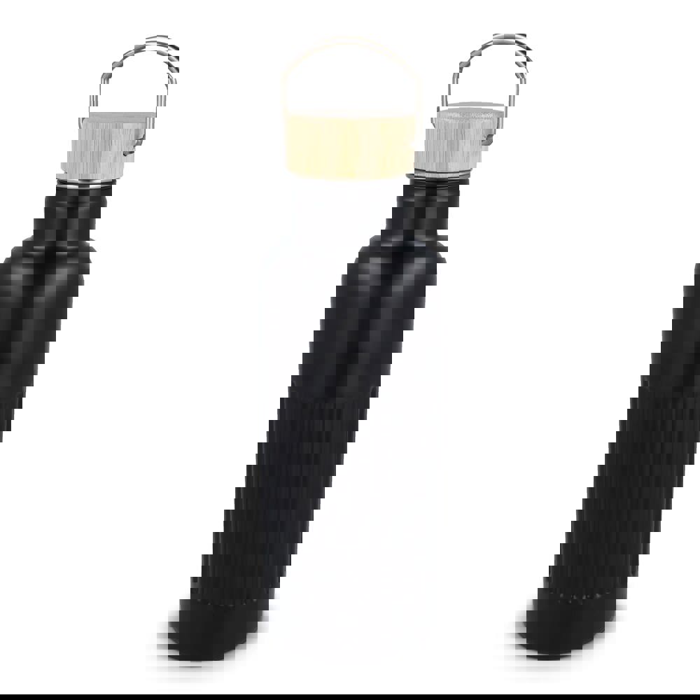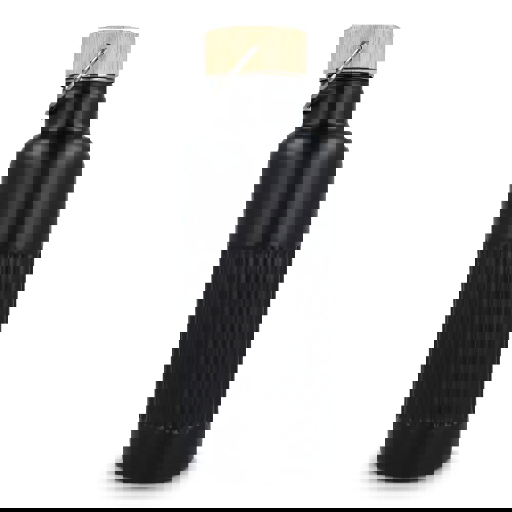 Recycelte Edelstahl-Isolierflasche mit 500 ml Fassungsvermögen und auslaufsicherem Bambusdeckel. Der Flaschenkörper hat ein modernes Streifenmuster, in einer Geschenkbox verpackt.