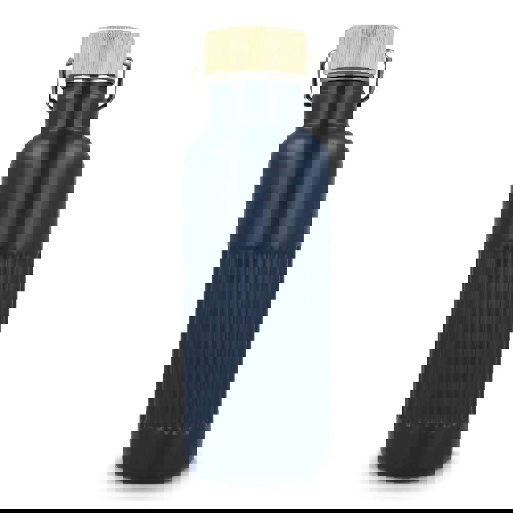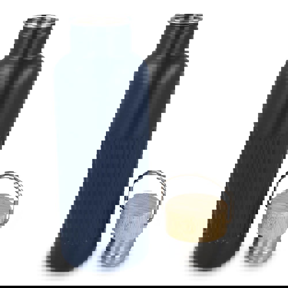 Recycelte Edelstahl-Isolierflasche mit 500 ml Fassungsvermögen und auslaufsicherem Bambusdeckel. Der Flaschenkörper hat ein modernes Streifenmuster, in einer Geschenkbox verpackt.