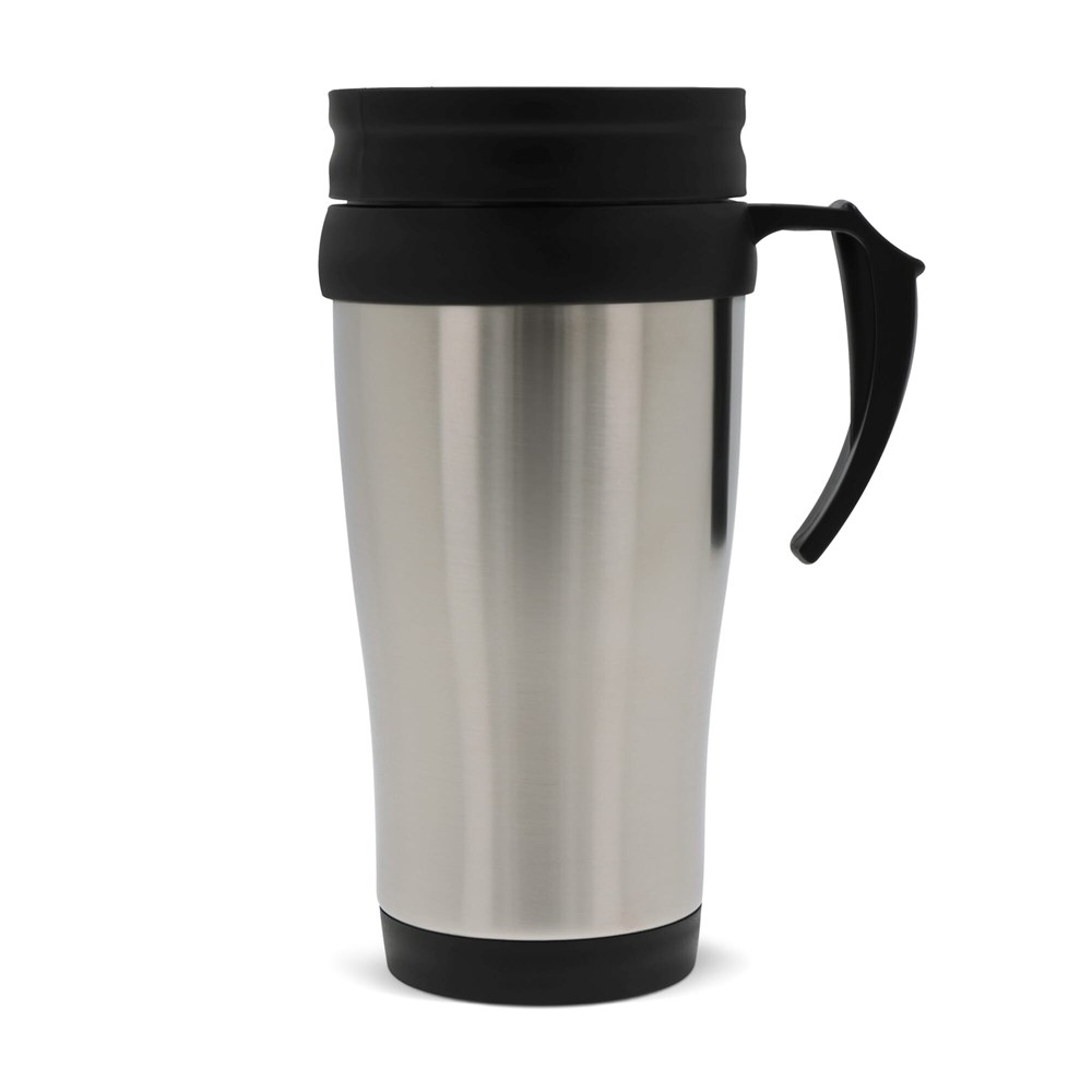 Isolierbecher speziell für das Auto. Dieser besteht außen aus Edelstahl und innen aus Kunststoff. Der Becher ist nicht auslaufsicher und sollte daher möglichst gerade transportiert werden.