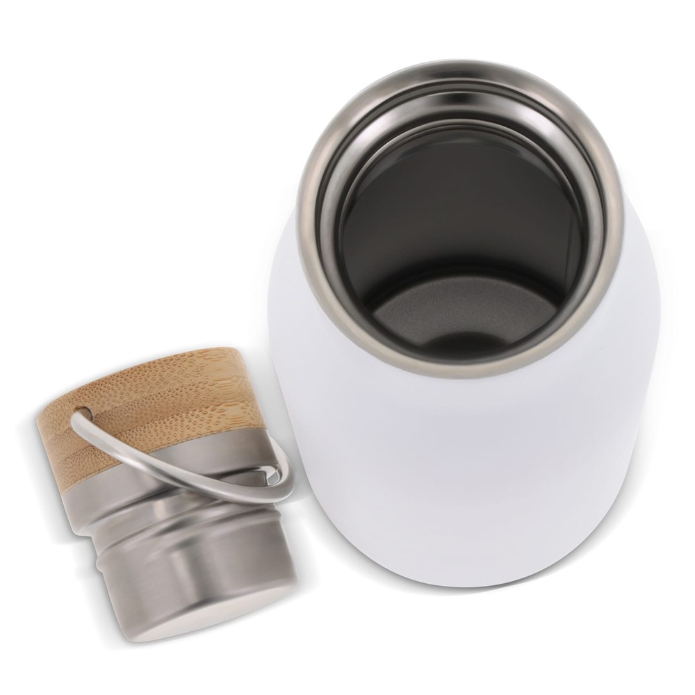 Doppelwandige Vakuum-Isolierflasche mit Holzdeckel. Mit einer matten Beschichtung für ein modernes Finish.