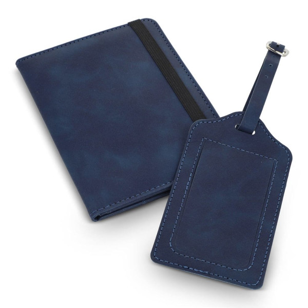 Reiseset mit PU-Reisedokumentetui mit RFID-Schutz, elastischem Verschluss, Platz für Pass, 4 Kreditkarten, 2 SIM-Karten, weitere Fächer (z. B. Bordkarten). Inkl. Gepäckanhänger mit Schnallenriemen und Kontaktkarte (Name, Telefon, Adresse, E-Mail) auf Englisch.