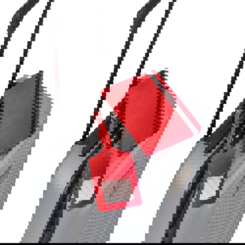 Reiseset mit PU-Reisedokumentetui mit RFID-Schutz, elastischem Verschluss, Platz für Pass, 4 Kreditkarten, 2 SIM-Karten, weitere Fächer (z. B. Bordkarten). Inkl. Gepäckanhänger mit Schnallenriemen und Kontaktkarte (Name, Telefon, Adresse, E-Mail) auf Englisch.