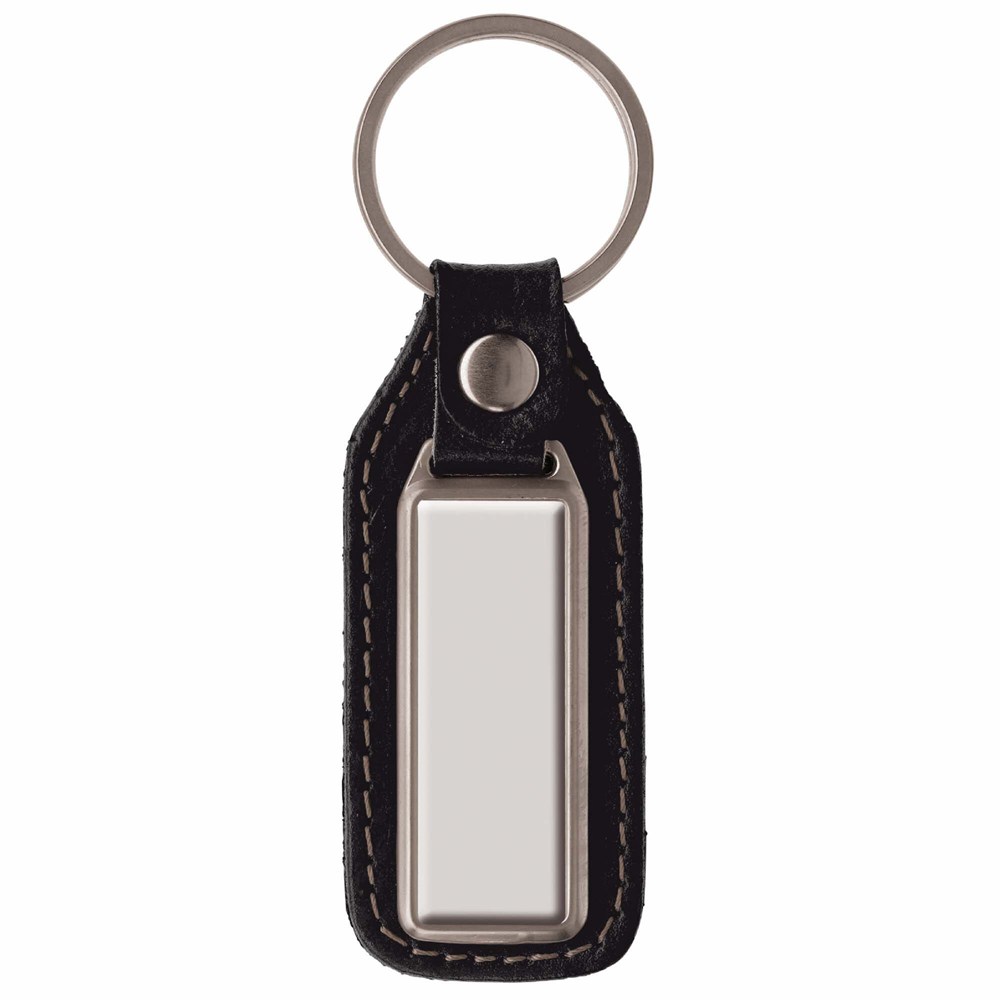 Rechteckiger Metallschlüsselanhänger aus echtem Leder. Einseitiges Doming.
