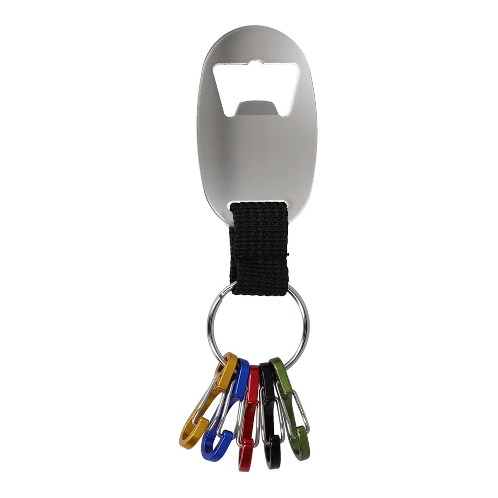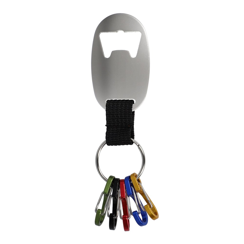 Flaschenöffner-Schlüsselanhänger aus recyceltem Aluminium mit 5 kleinen Karabinerhaken zur Organisation Ihrer Schlüssel. Ein praktisches und umweltfreundliches Accessoire für den täglichen Gebrauch.