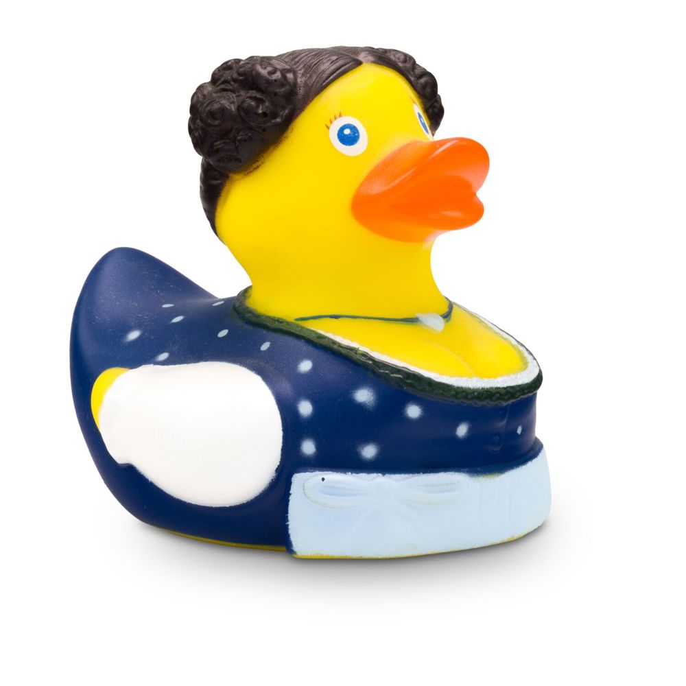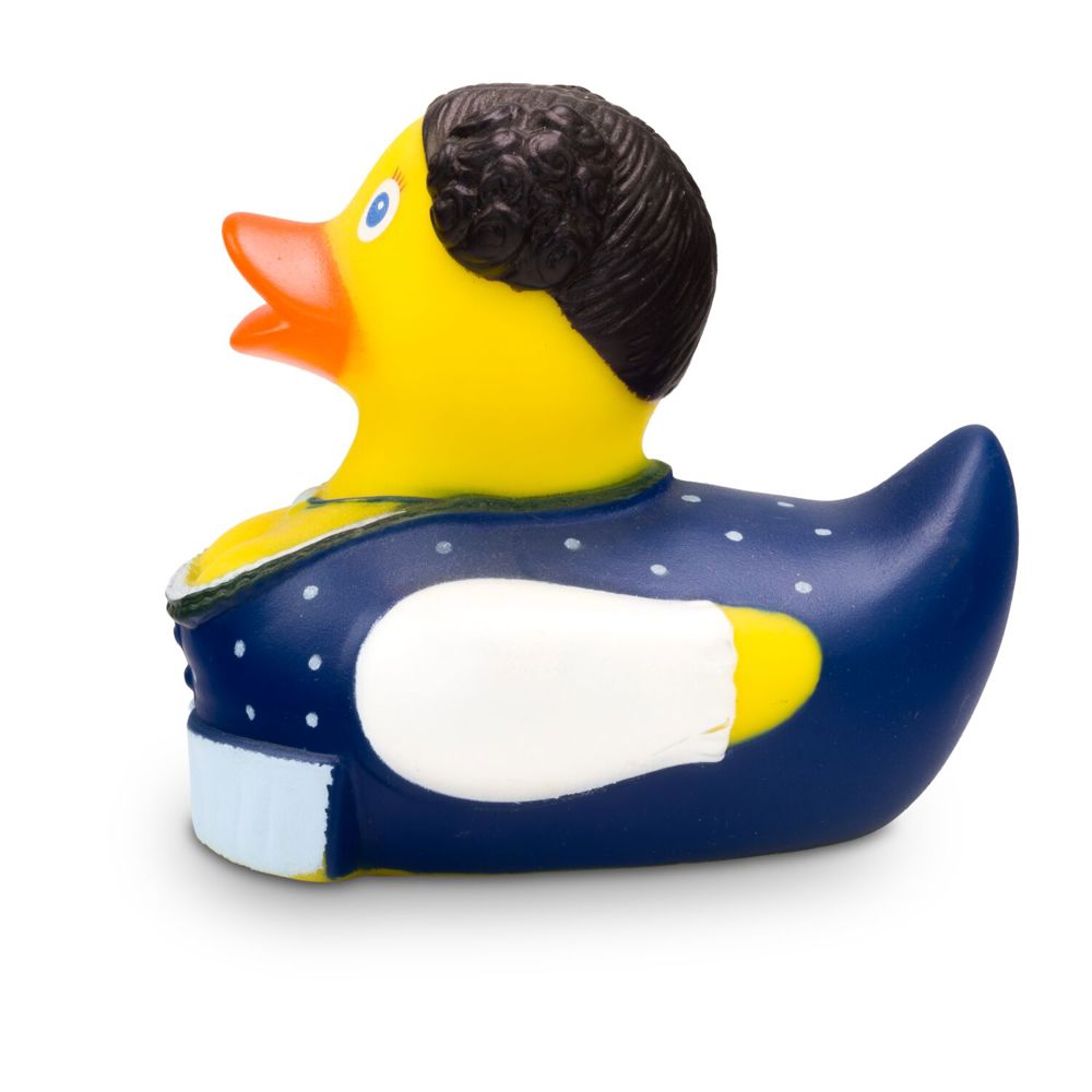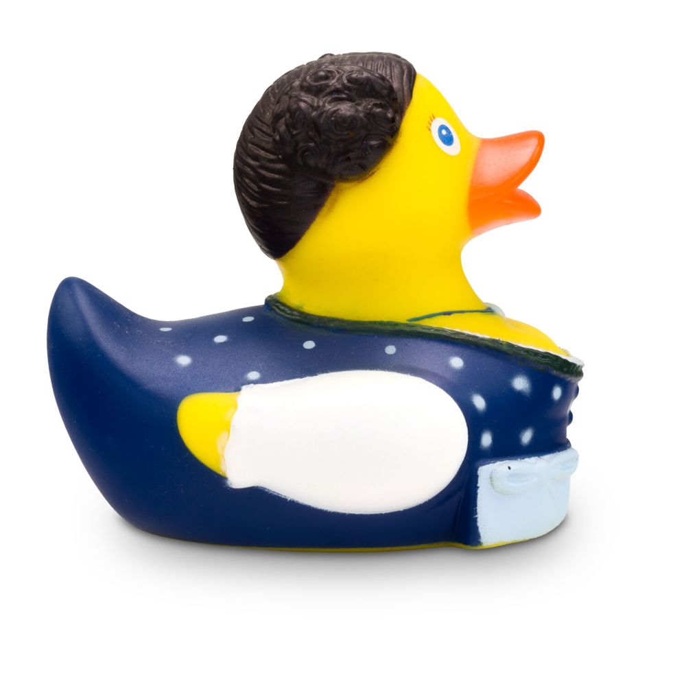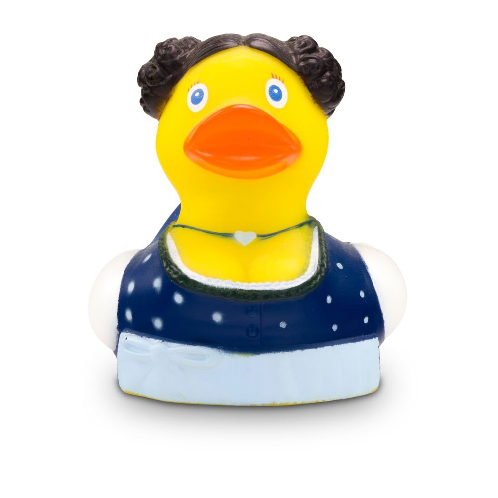 Theresa Trachtenherz lebt für die alpenländischen Trachtenfeste. Sie trägt eine traditionelle dunkelblaue Tracht mit weißen Punkten und eine Schürze in Hellblau, dazu eine weiße Trachtenbluse mit Puffärmeln. Ihre Dirndl-Halskette mit Herzanhänger und die Hochsteckfrisur machen ihr Outfit komplett. Die perfekte Ente für bayerische, tiroler oder südtiroler Volksfeste! Größe: ca. 8 cm. Inklusive Quietschventil