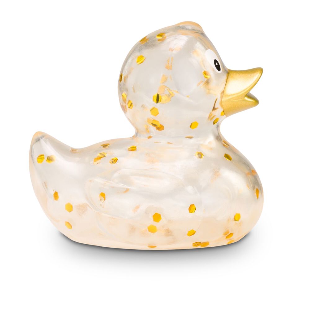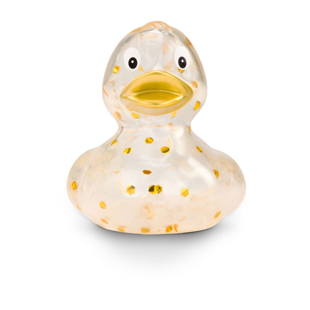 Fine Funkelgold macht jeden Ort zu einer Party. Sie trägt ein transparentes Kleid mit goldschimmerndem Glitzer-Konfetti und dazu einen goldenen Schnabel. Mit ihrem formschönen, zeitlosen Körper ist Fine der Badeenten-Klassiker in moderner Optik. Damit hat sie noch viele große und kleine Geschwister, auch in anderen Farben. Größe: ca. 8 cm. Inklusive Quietschventil