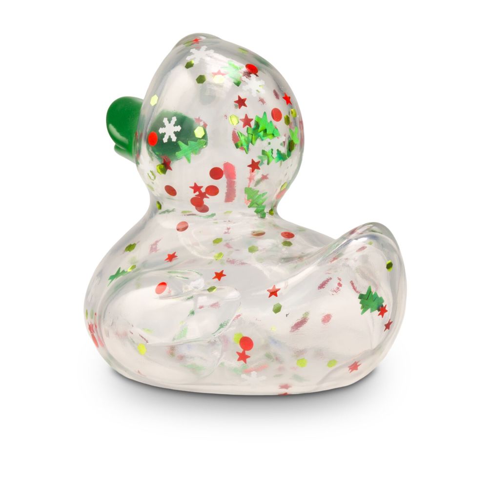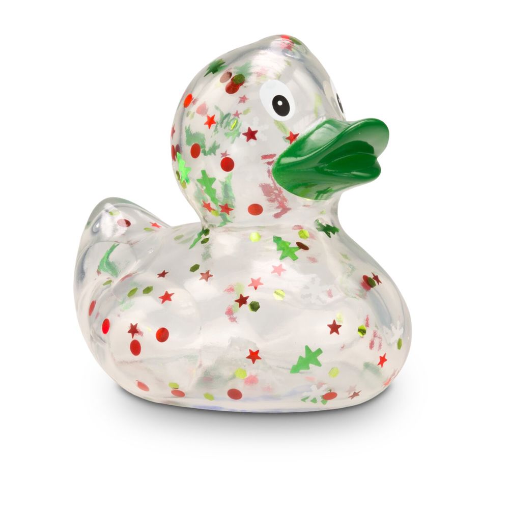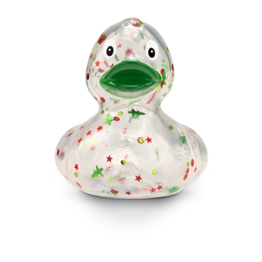 Luis Lametta erstrahlt in weihnachtlichem Glanz. Er trägt auf seinem durchsichtigen Gefieder roten und grünen Weihnachtsglitzer in verschiedenen Formen: Punkte, Sterne, Schneeflocken, Tannenbäume. Dazu passend hat er einen tannengrünen Schnabel. Durch das spezielle Herstellungsverfahren ist jede Ente ein Unikat. Nicht nur in der Winterzeit ein Hingucker. Größe: ca. 8 cm. Inklusive Quietschventil
