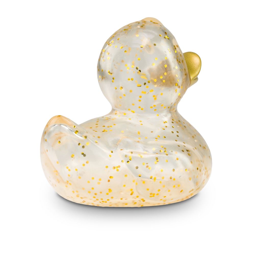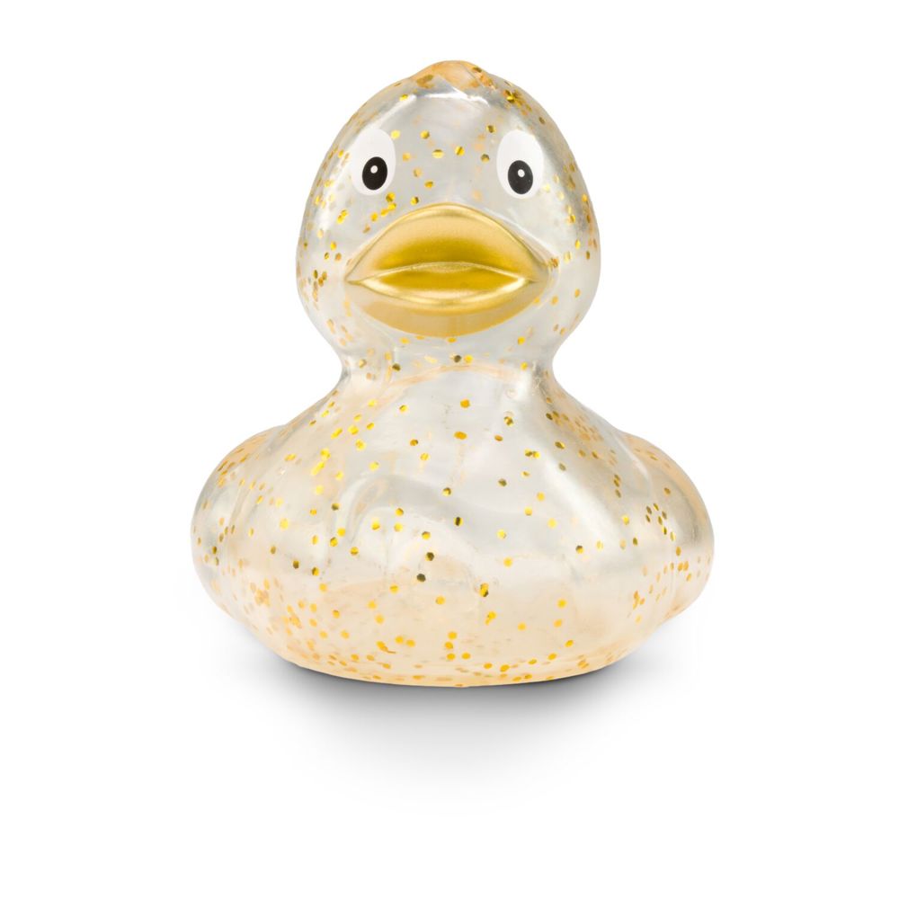 Gloria Goldglitzer funkelt mit Giselle Goldglitzer und den Sternen um die Wette. Goldene Partikel glitzern auf ihrem klar-transparenten Körper. Durch das spezielle Herstellungsverfahren sieht jede Gloria Goldglitzer anders aus und ist damit ein echtes Unikat. Der vollfarbig goldene Schnabel rundet das glänzende Erscheinungsbild ab. So besonders ihr Erscheinungsbild, so klassisch ihre Körperform. Ihr formschönes und zeitloses Design gehört zu den Badeenten-Klassikern. Damit hat sie noch viele große und kleine Geschwister, auch in anderen Farben. Größe: ca. 8 cm. Inklusive Quietschventil