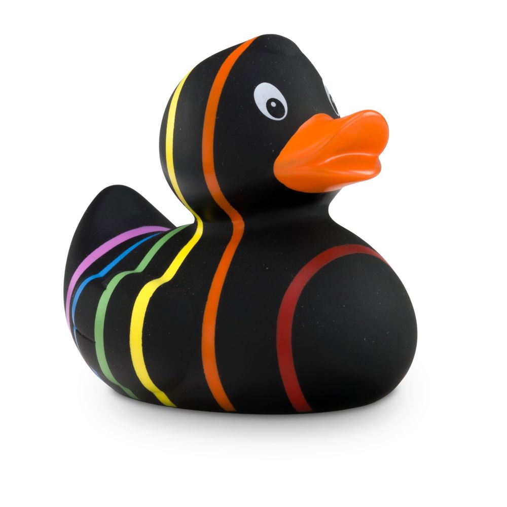 Rebecca Regenbogen - die coole Quietscheente für alle, die es bunt und trotzdem elegant mögen. Mit ihrem schwarzen Grundton und sechs leuchtenden Streifen in Pink, Blau, Grün, Gelb, Orange und Rot steht sie für besondere Vielfalt und ist ein echter Hingucker in jeder Badewanne. Größe: ca. 8 cm. Inklusive Quietschventil